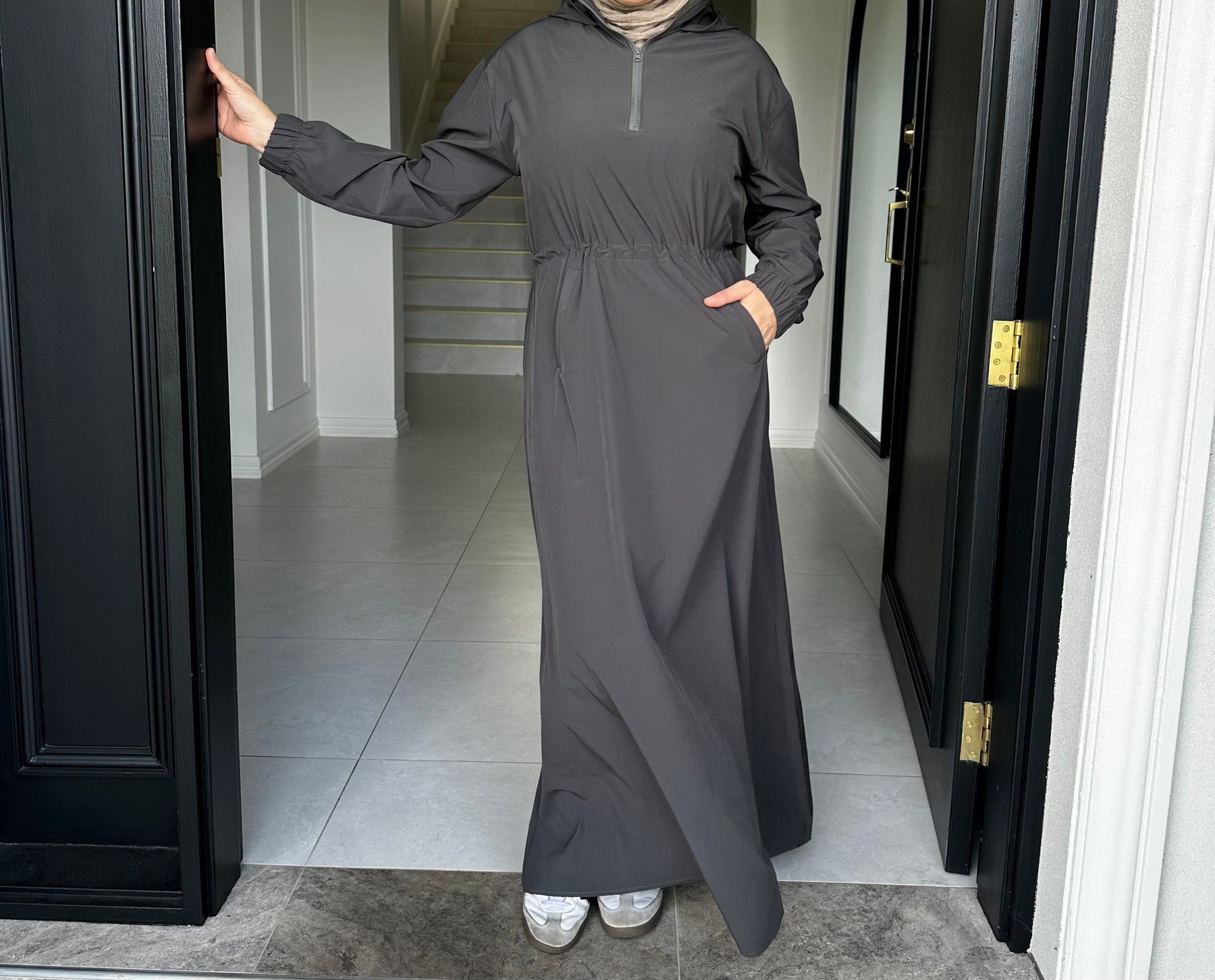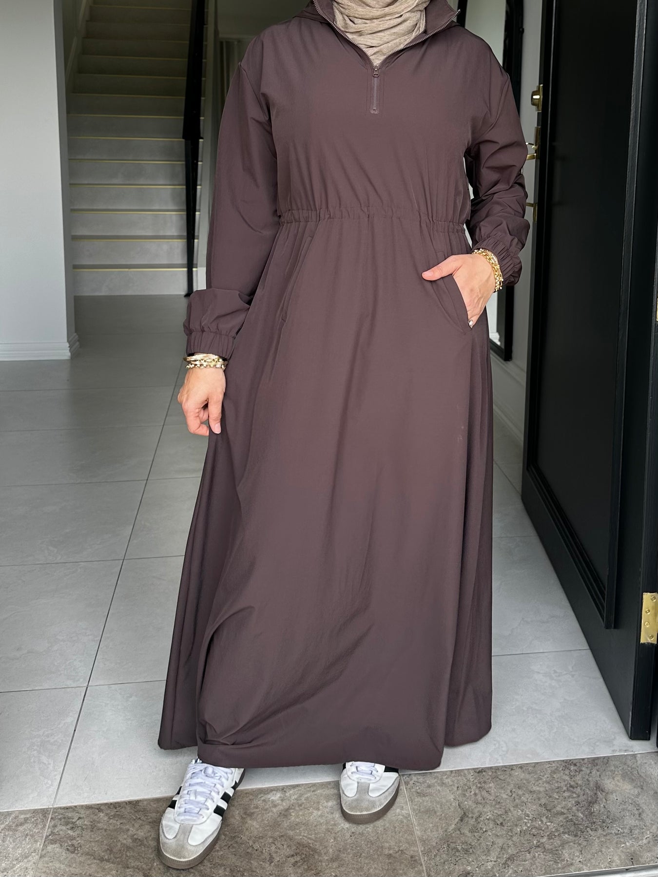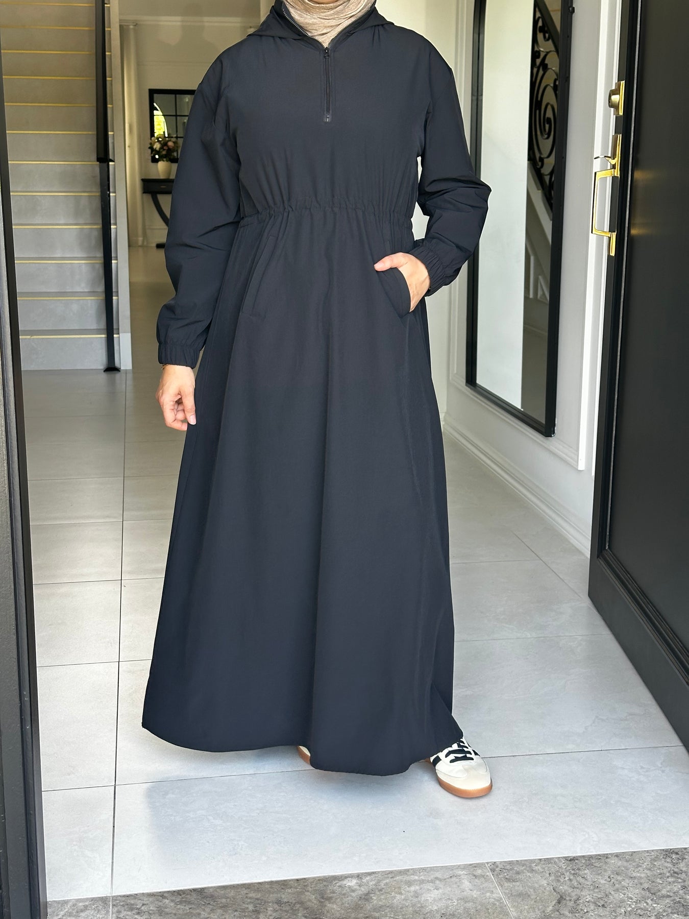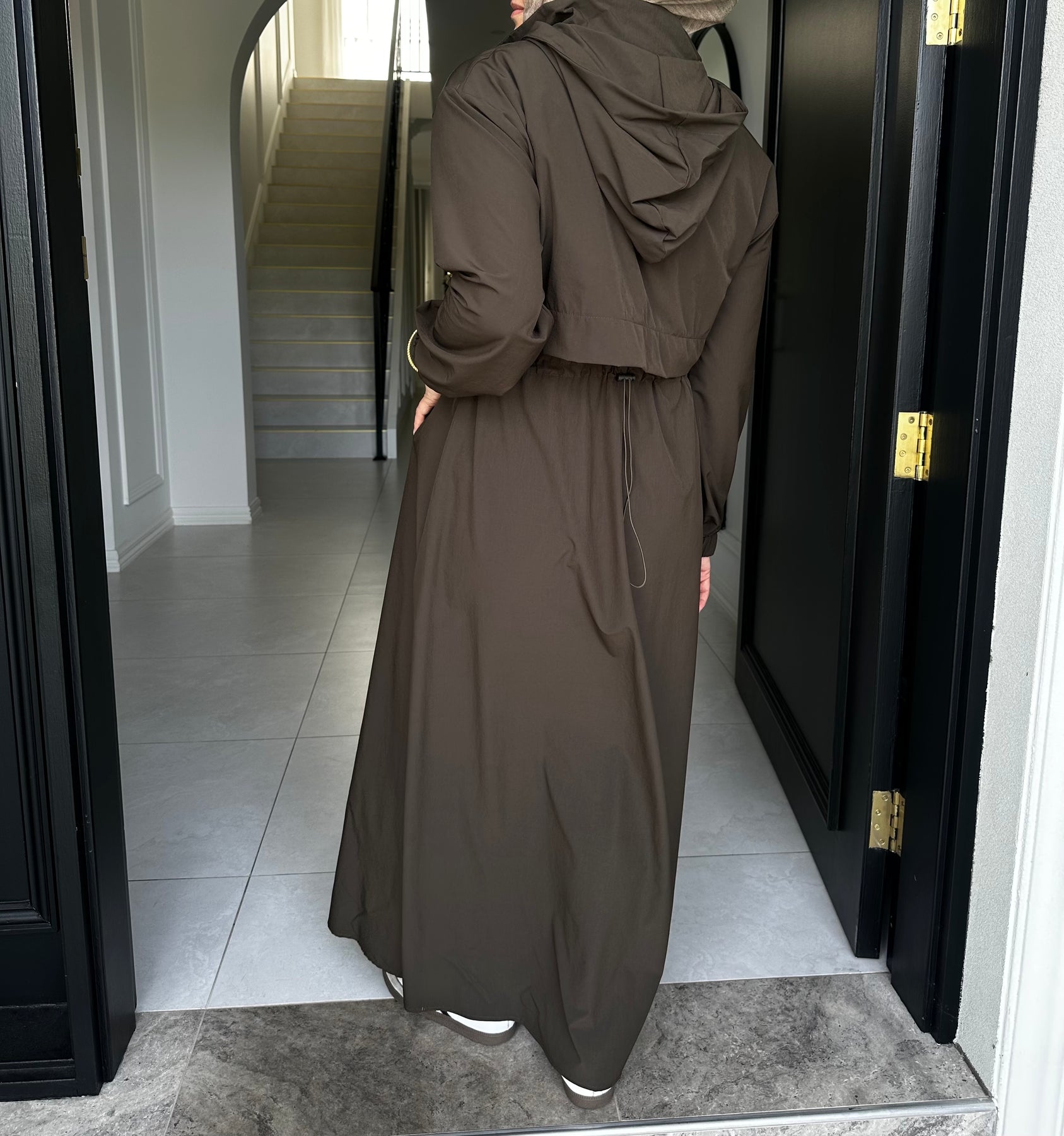 Sports fabric dress with drawstring and flap at back