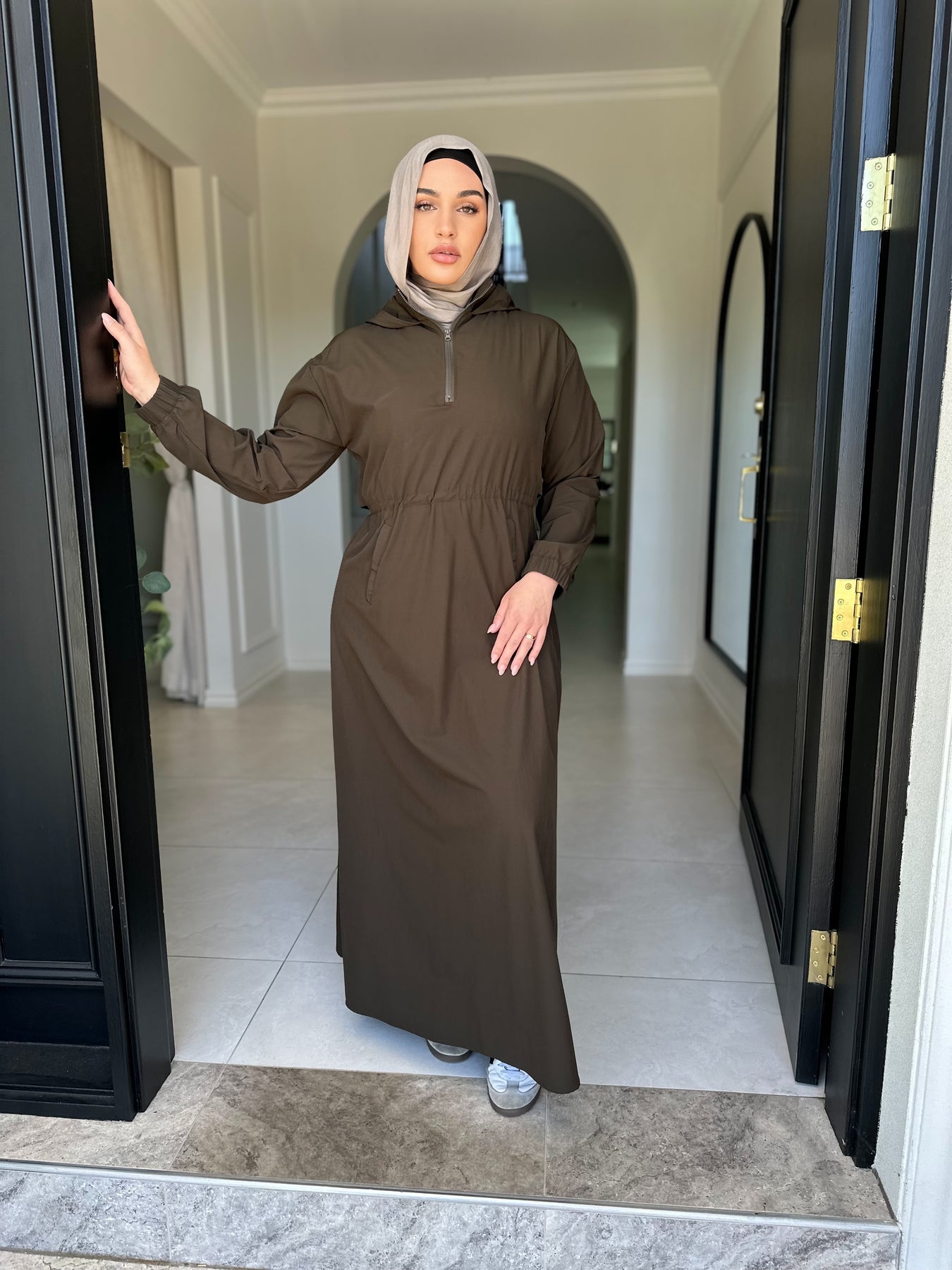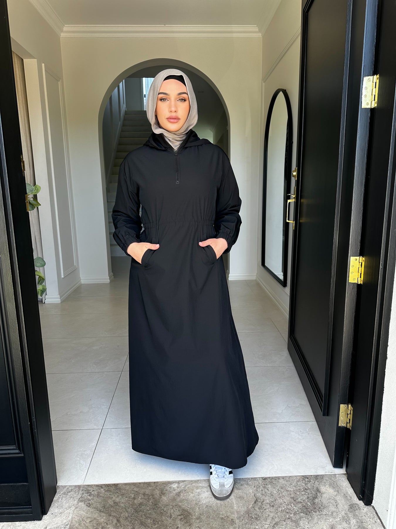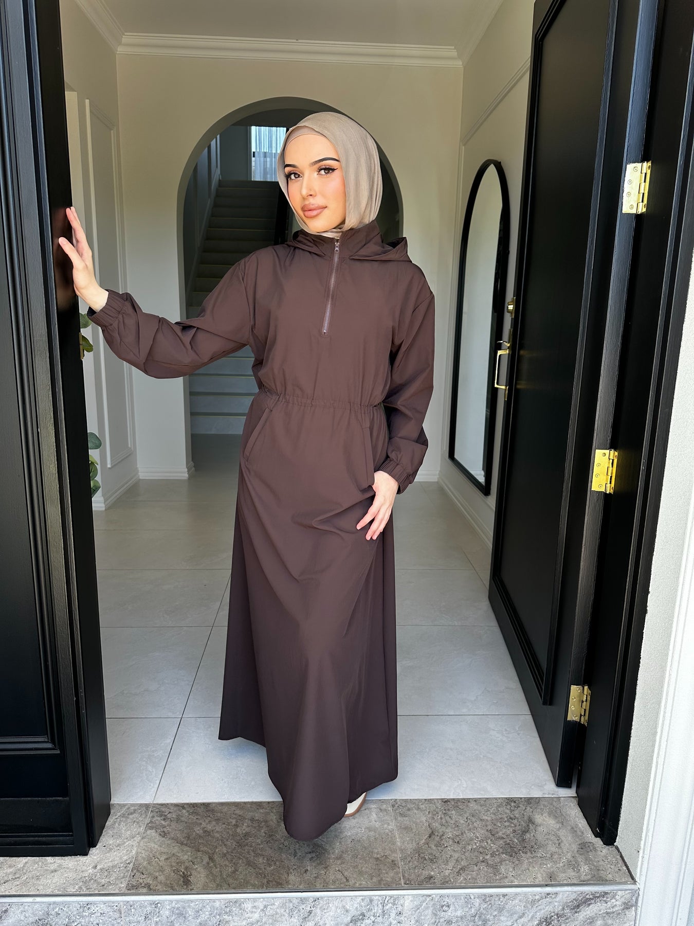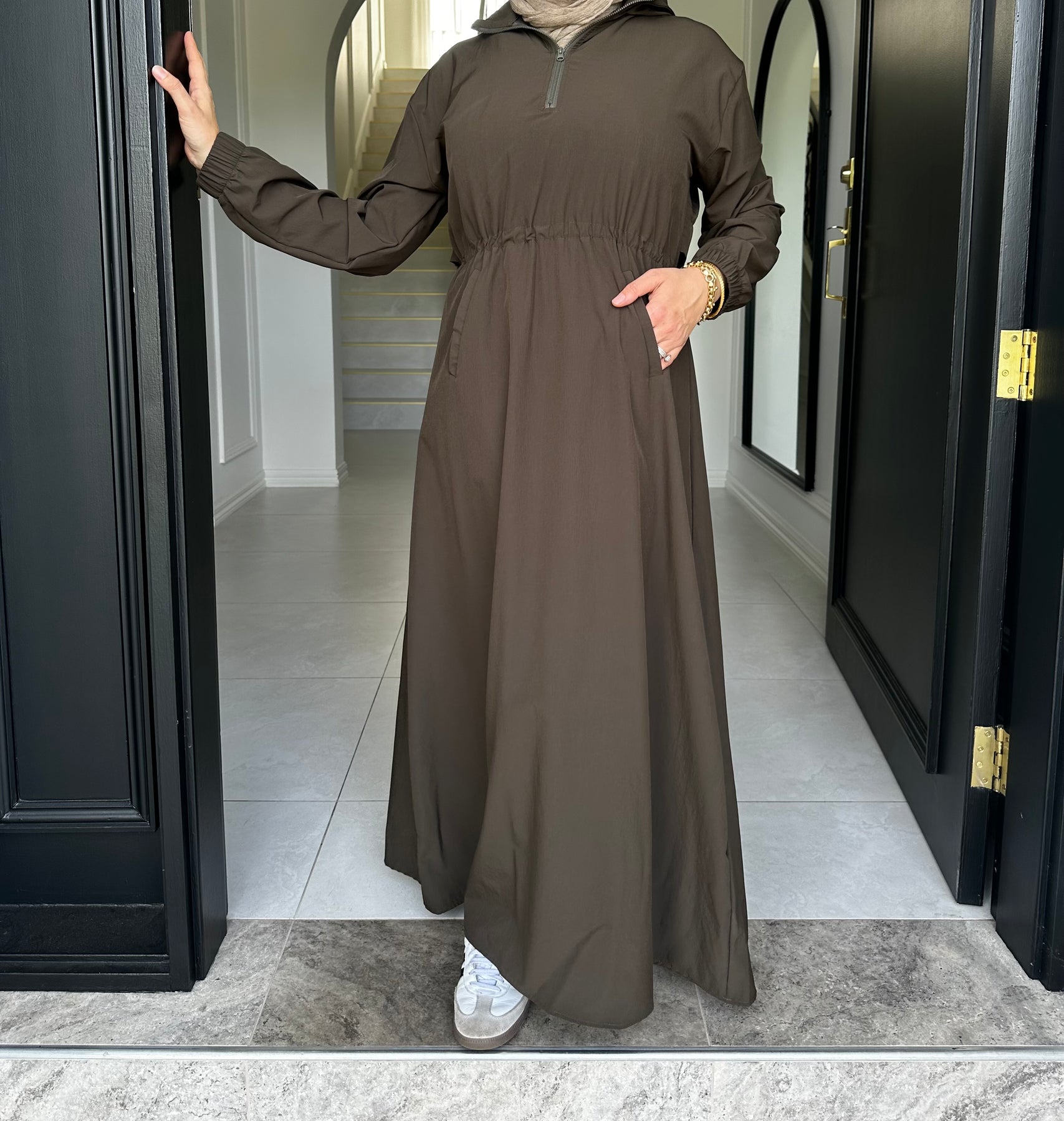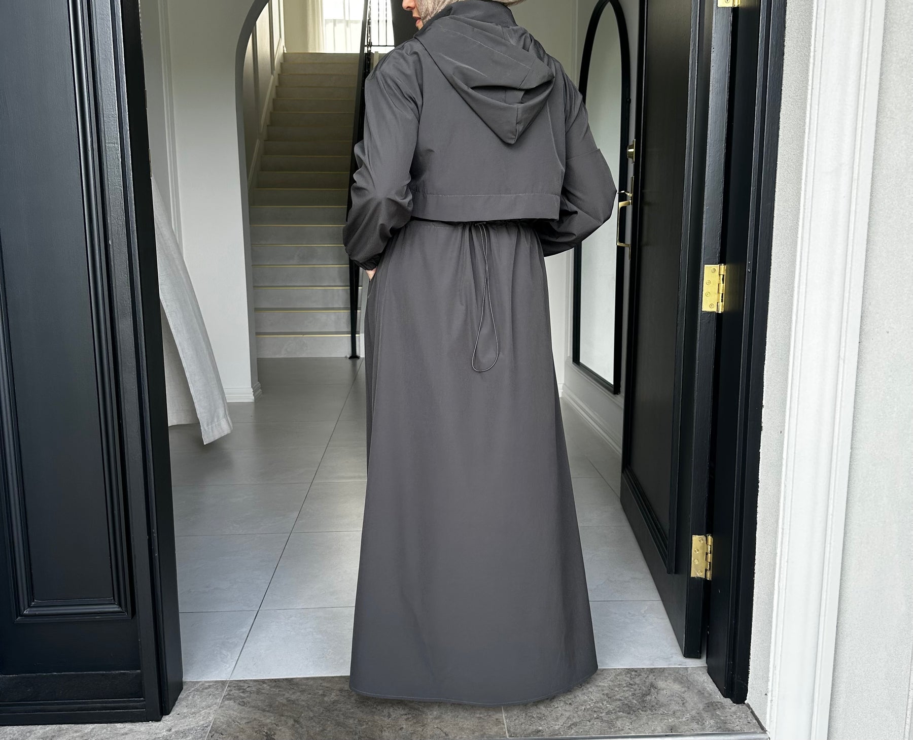 Sports fabric dress with drawstring and flap at back