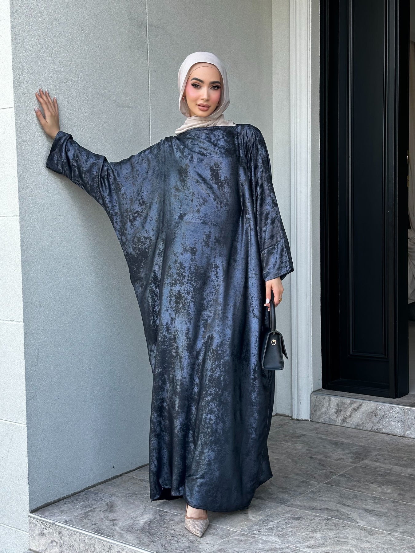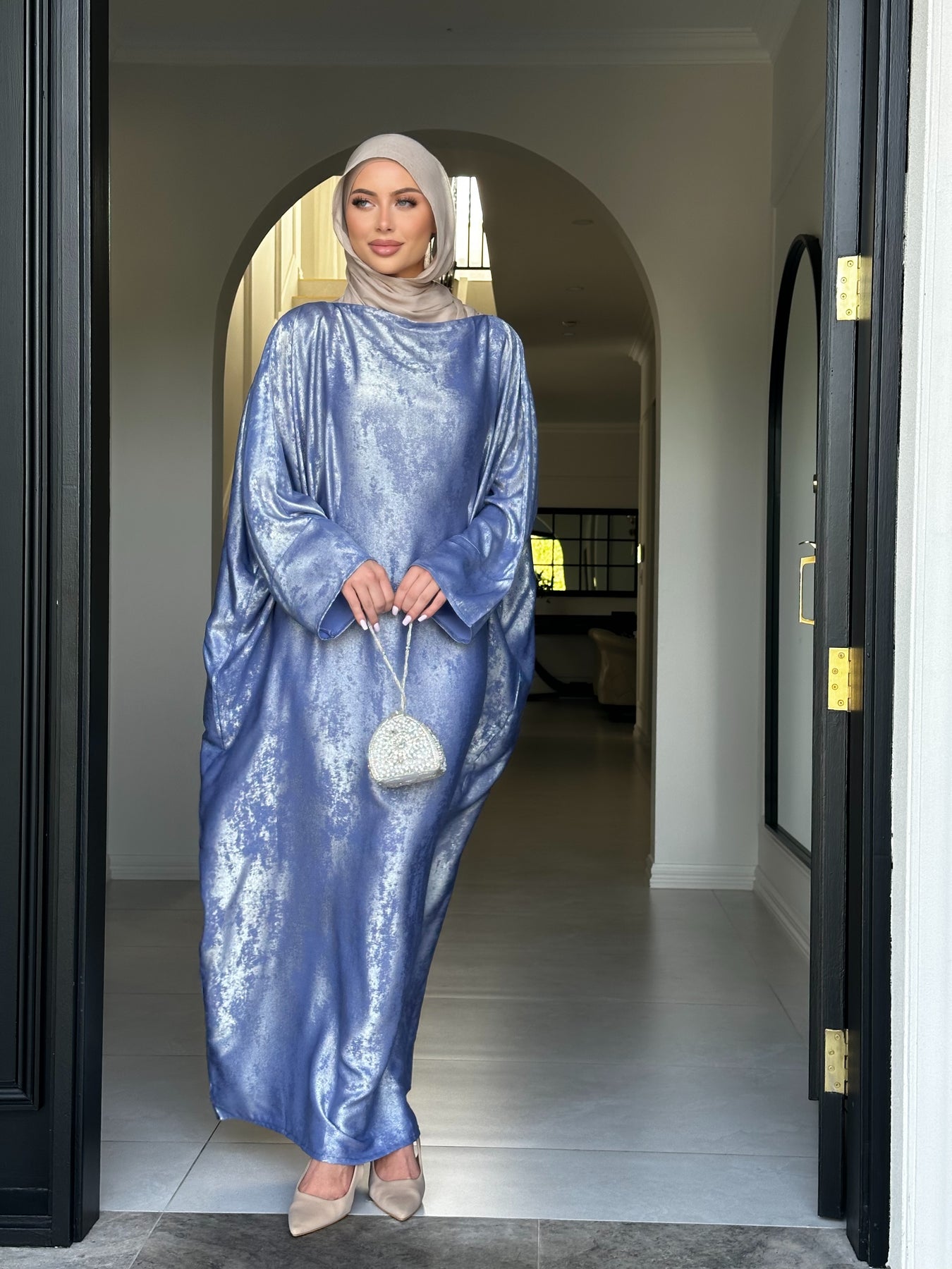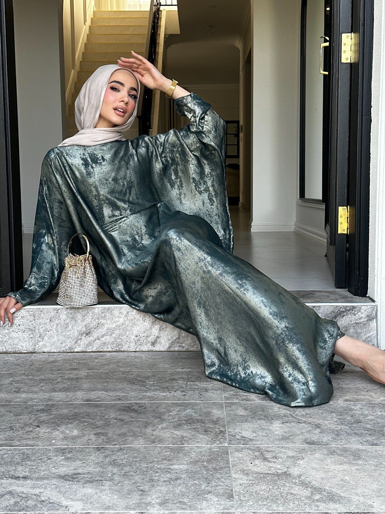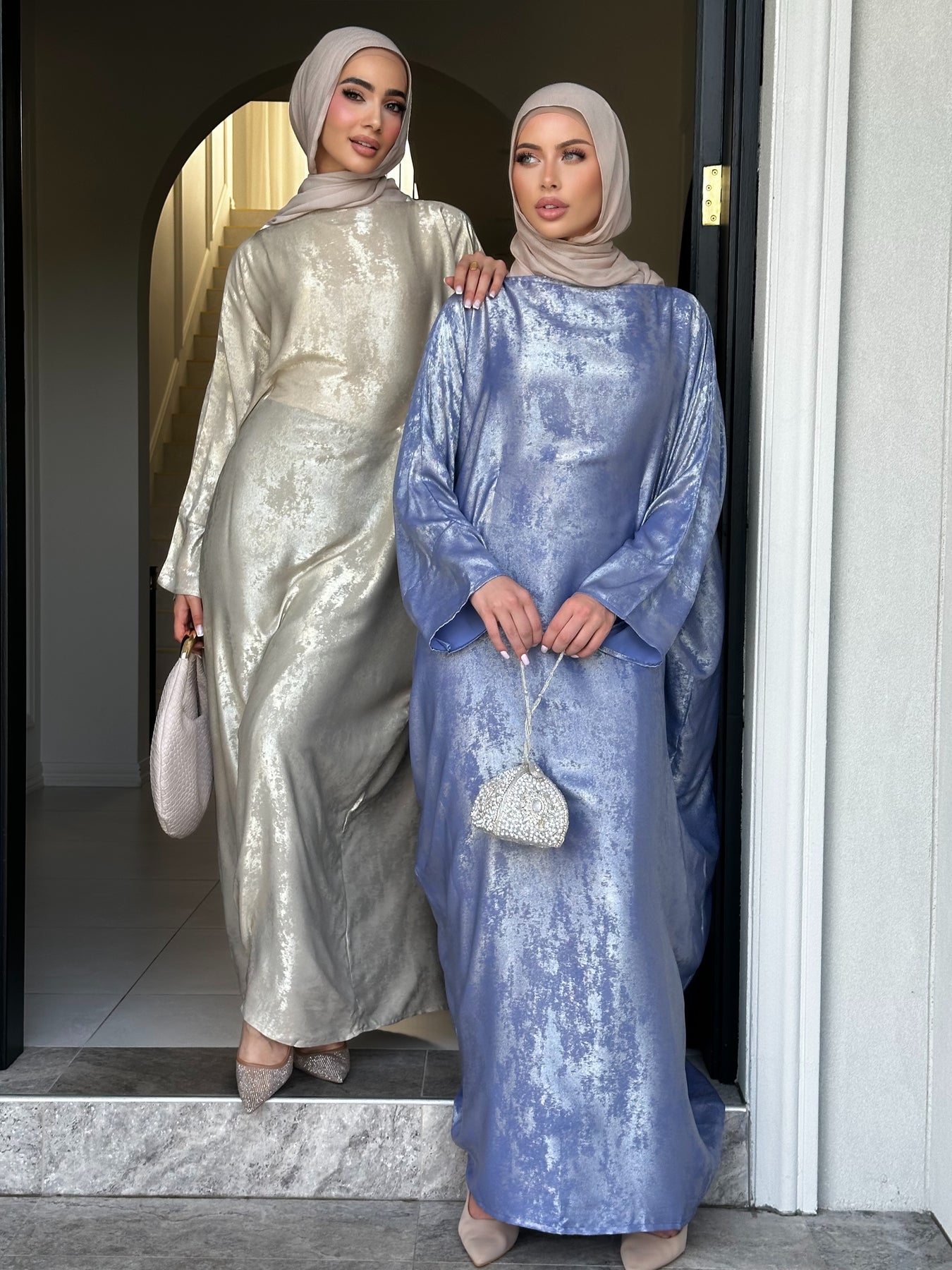 Lightweight foil fabric batwing dress with tie inside to cinch the waist