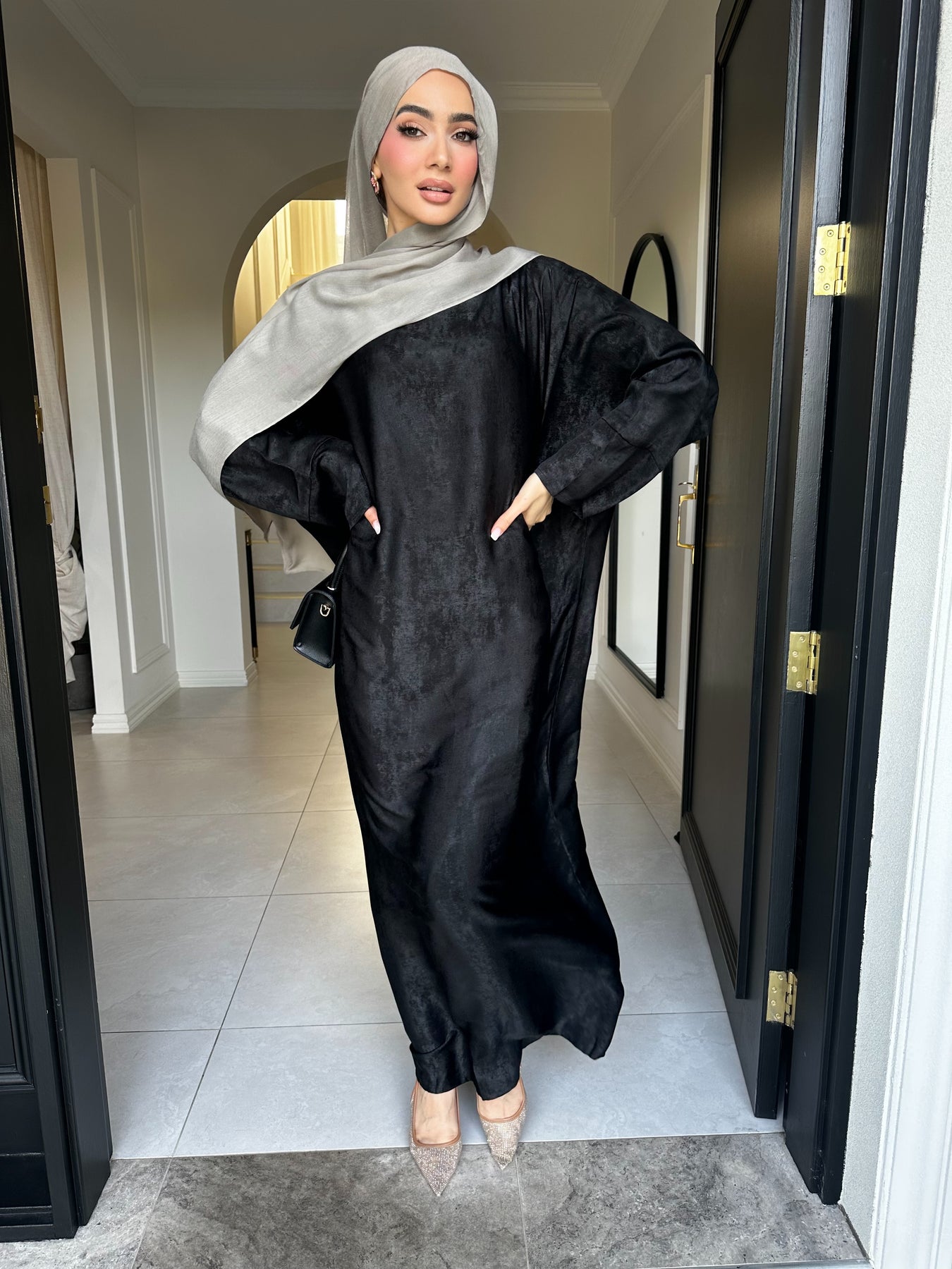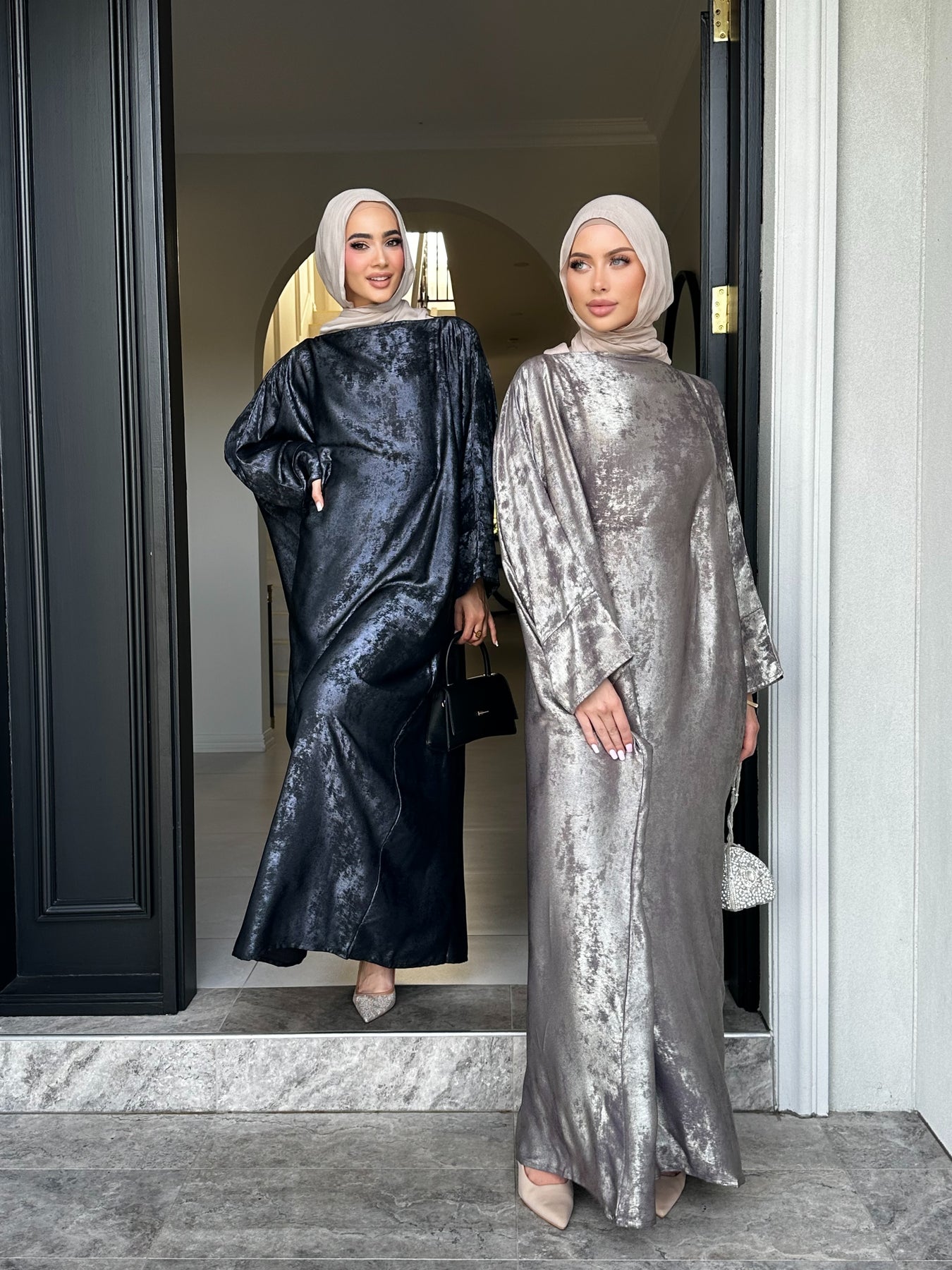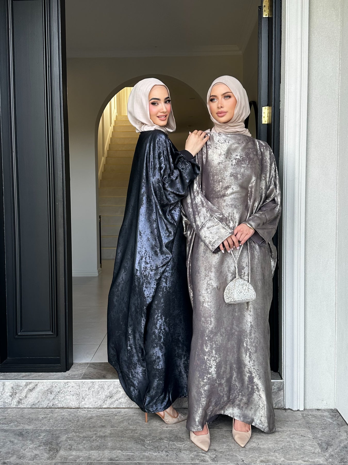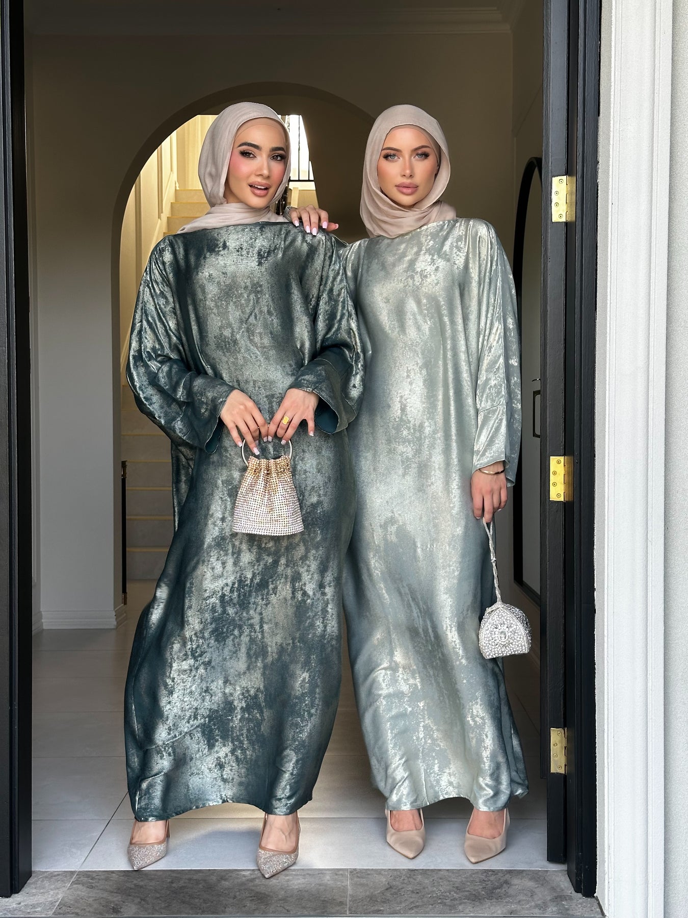 Lightweight foil fabric batwing dress with tie inside to cinch the waist
