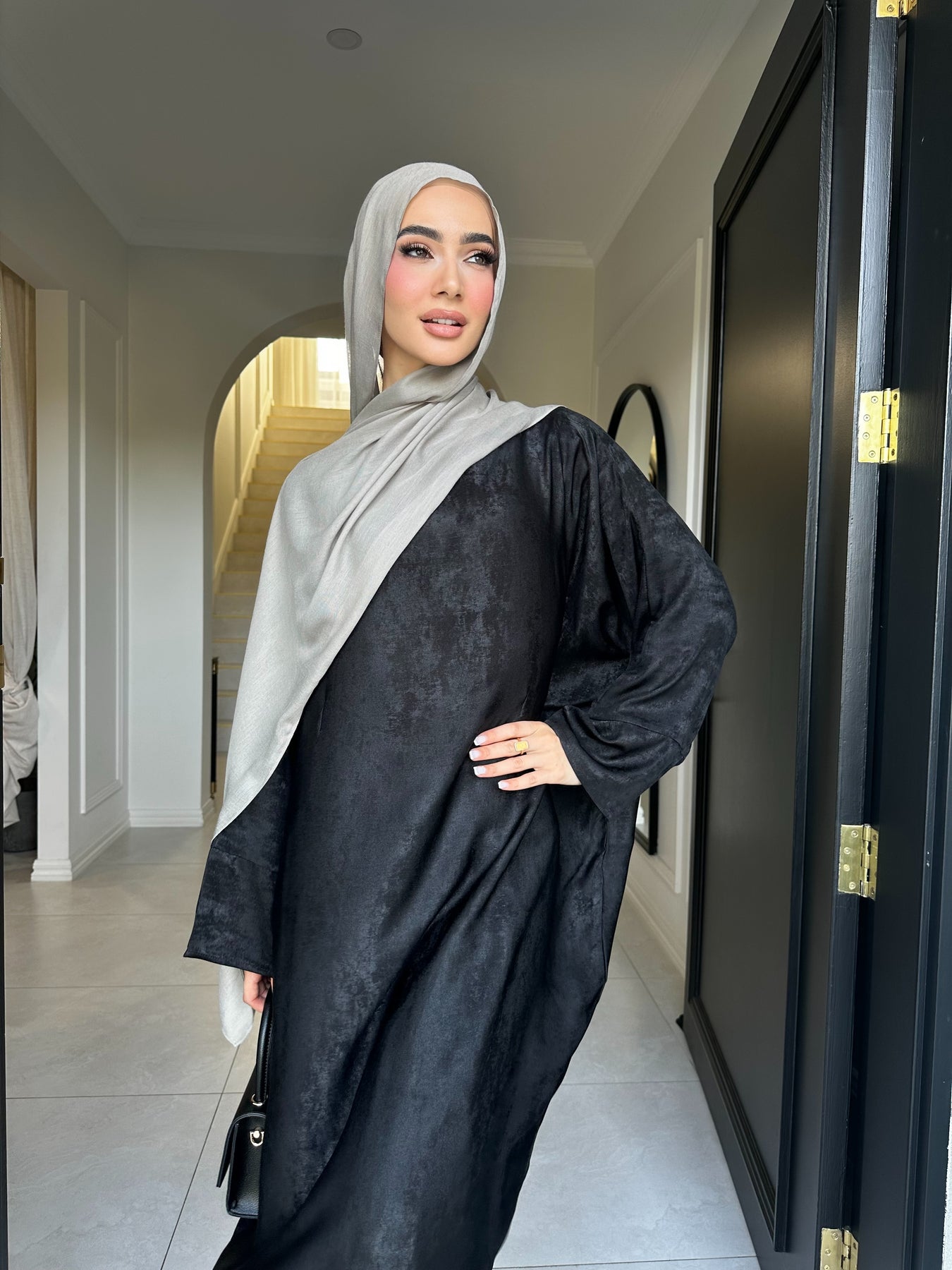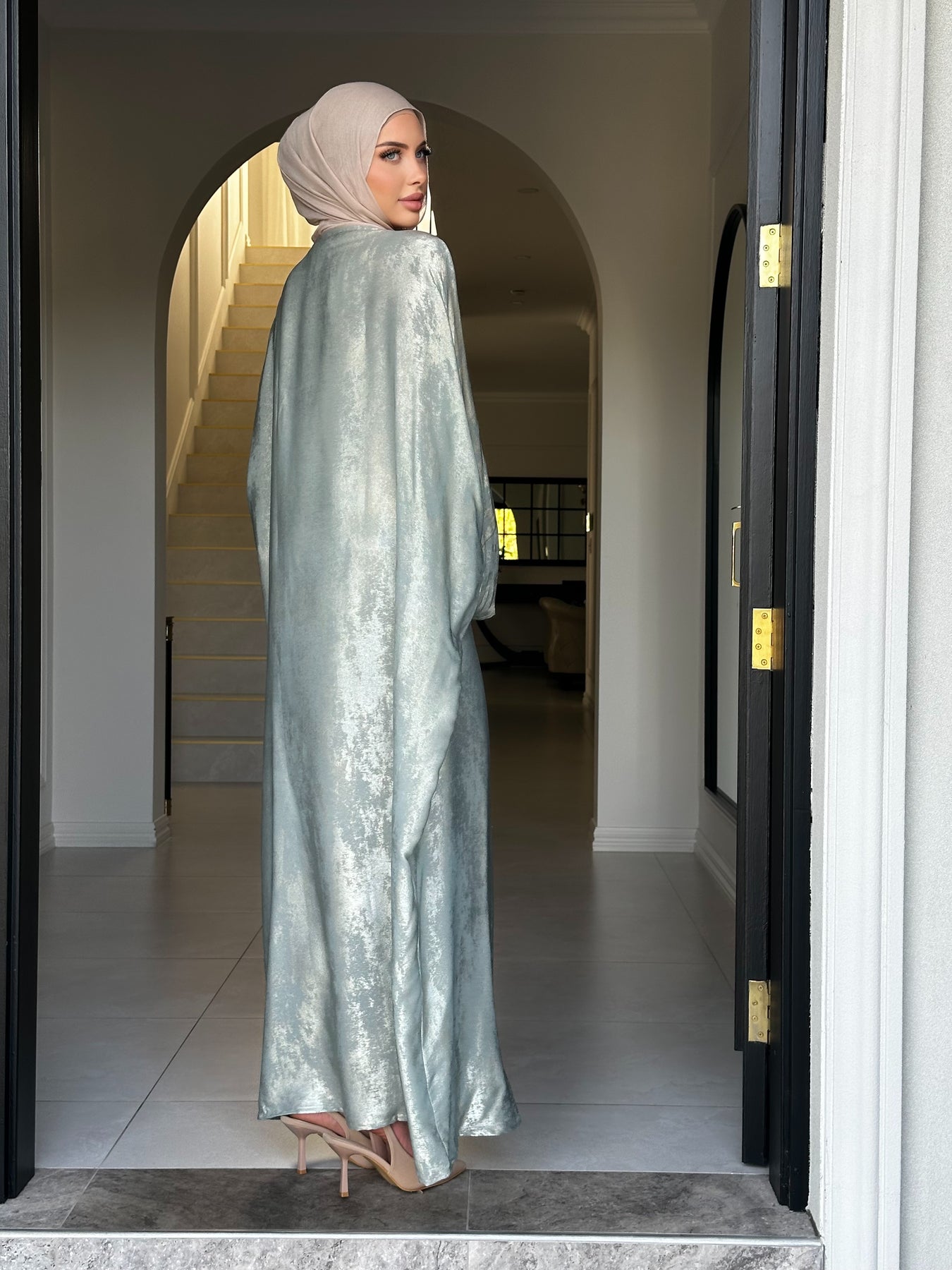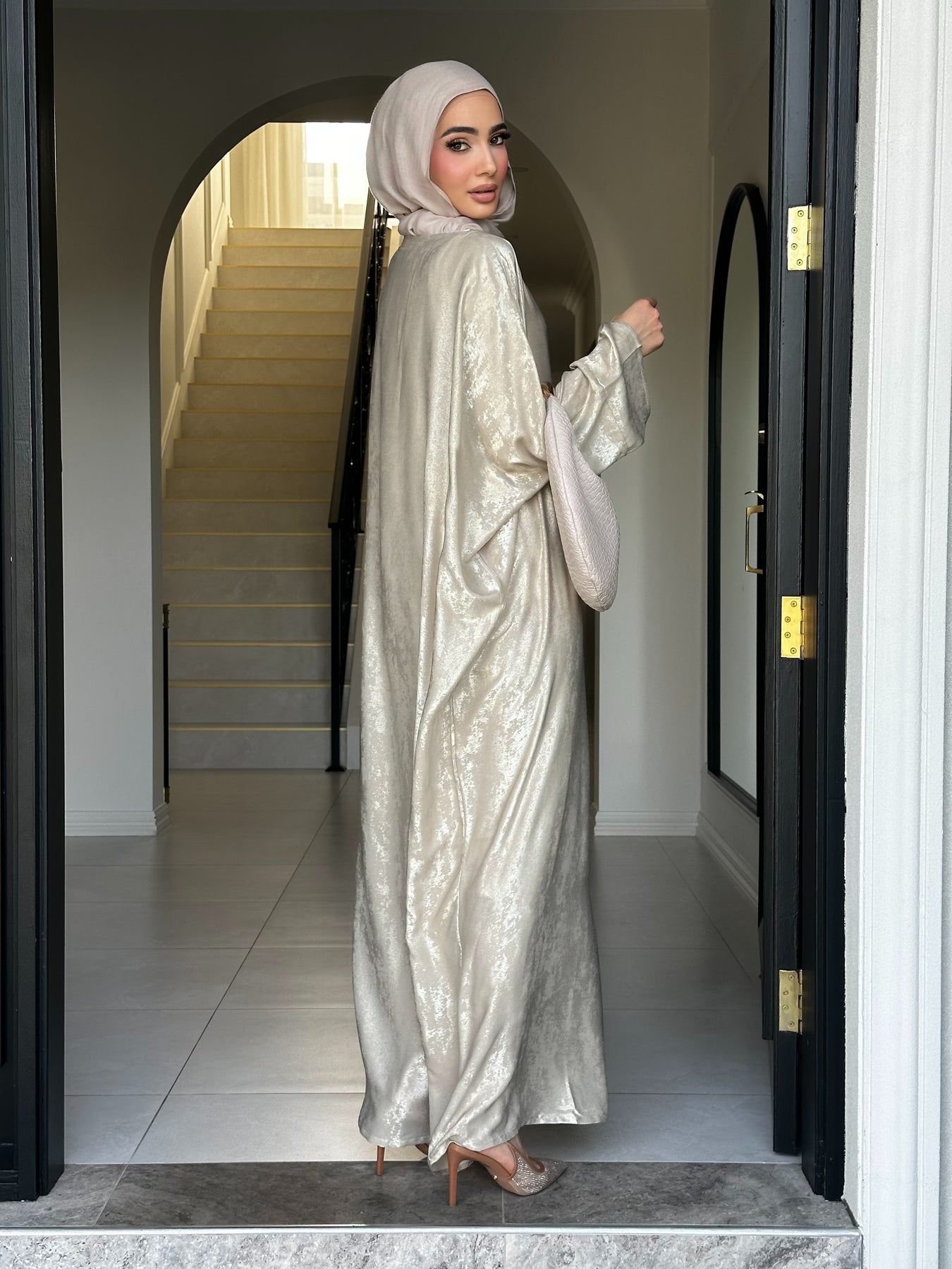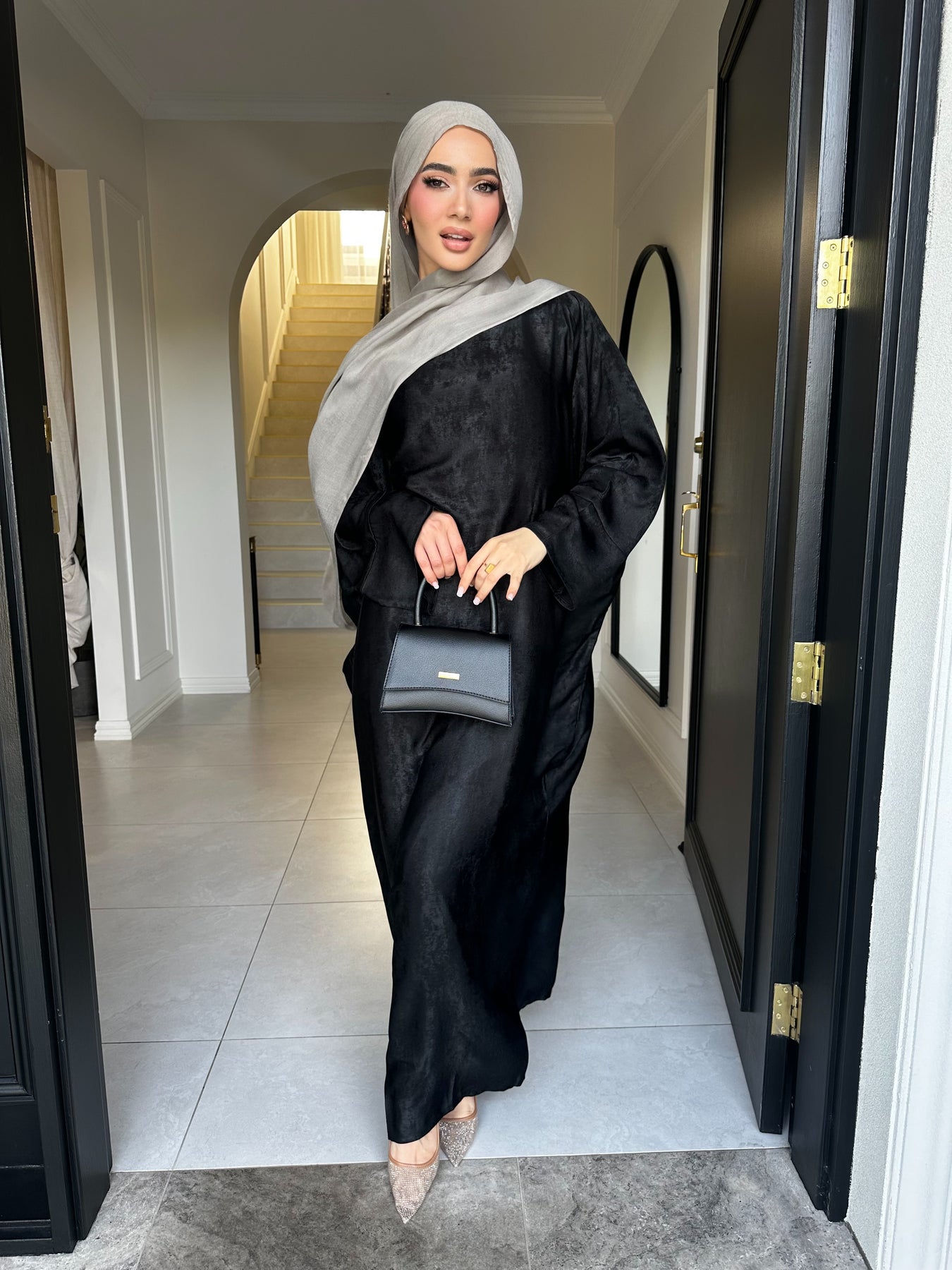 Lightweight foil fabric batwing dress with tie inside to cinch the waist