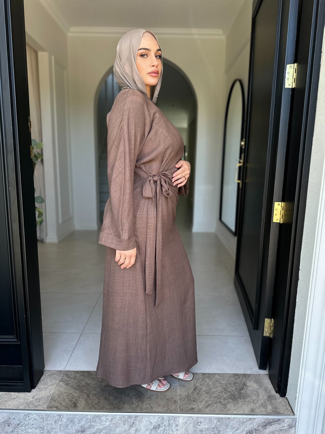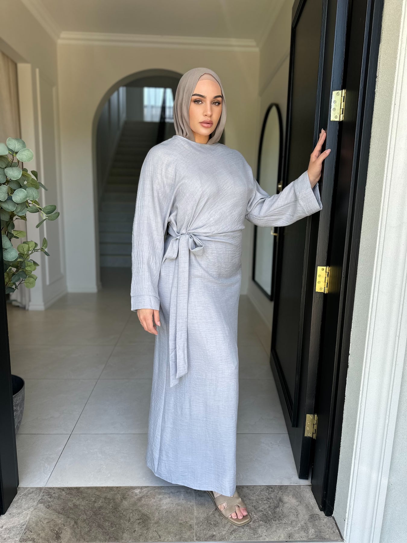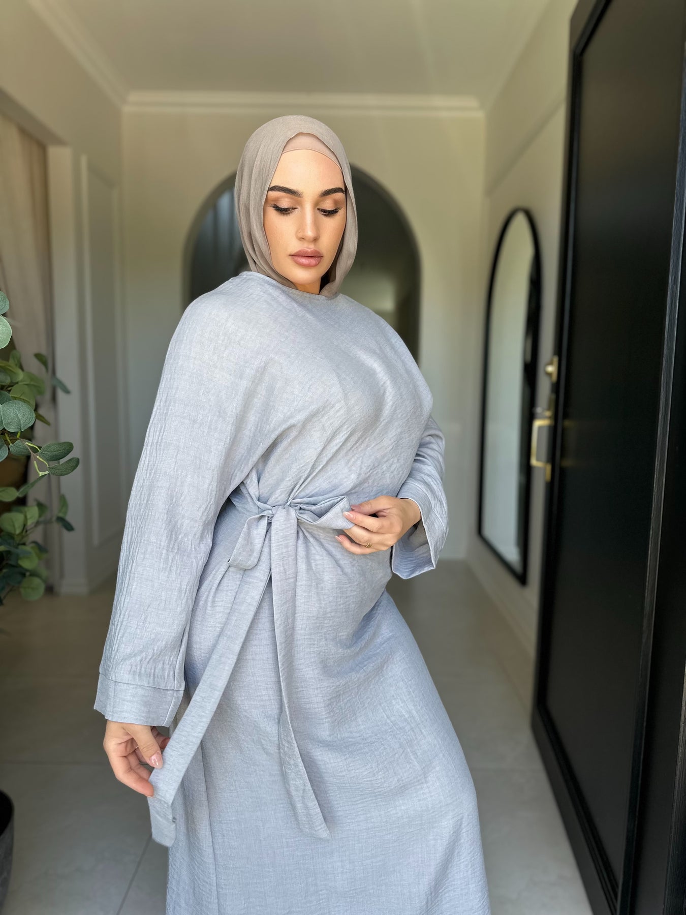 Linen blend fabric tie dress batwingÂ