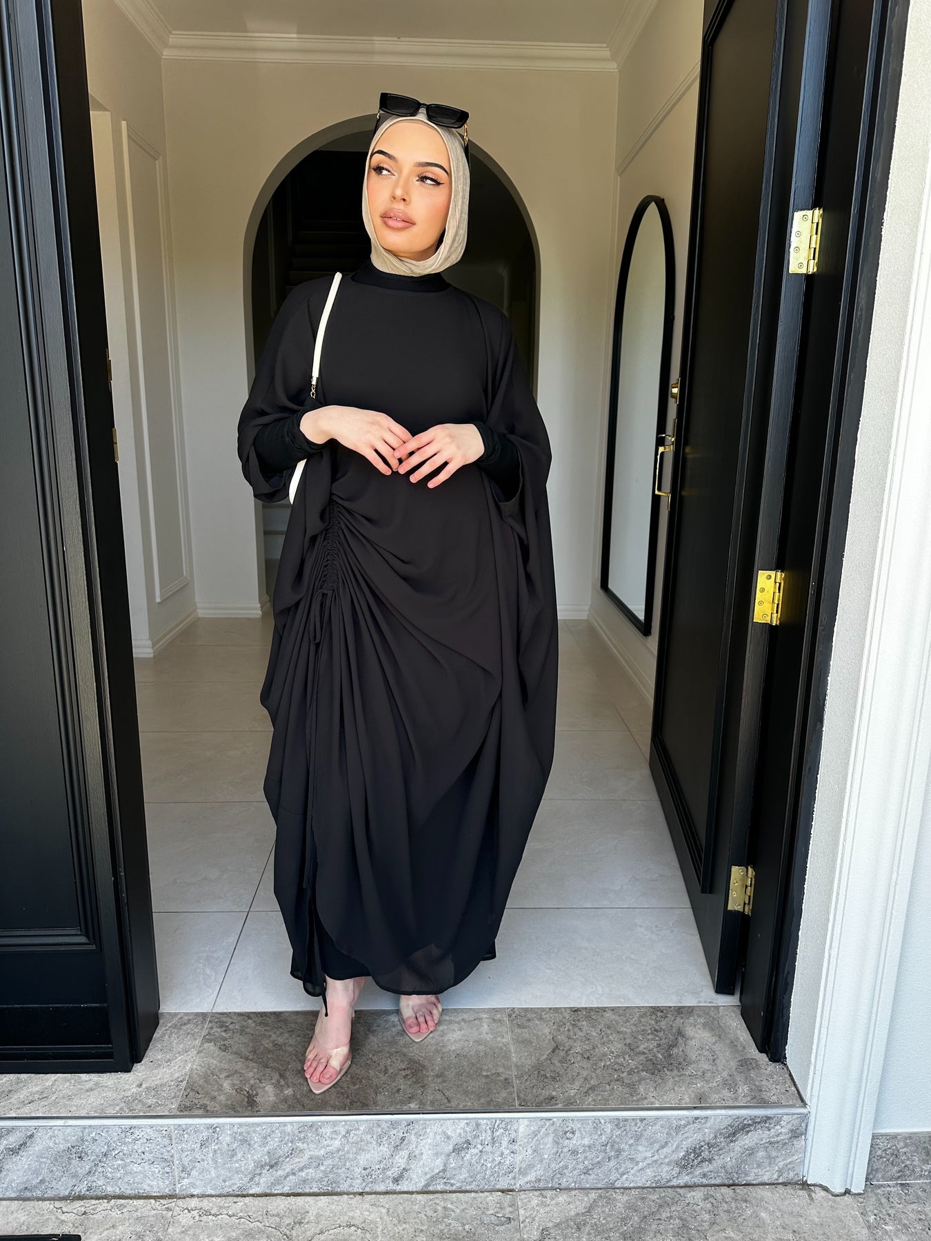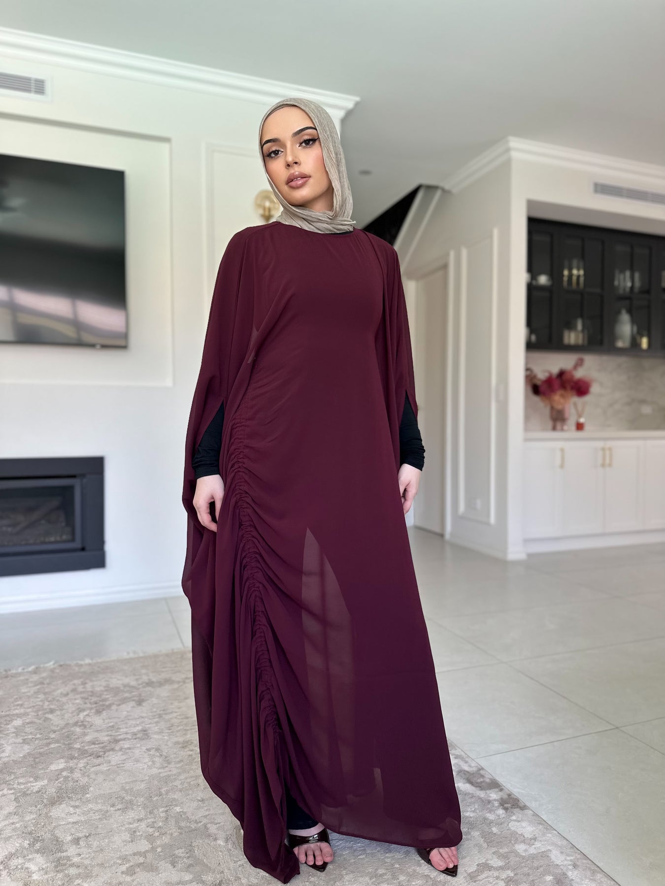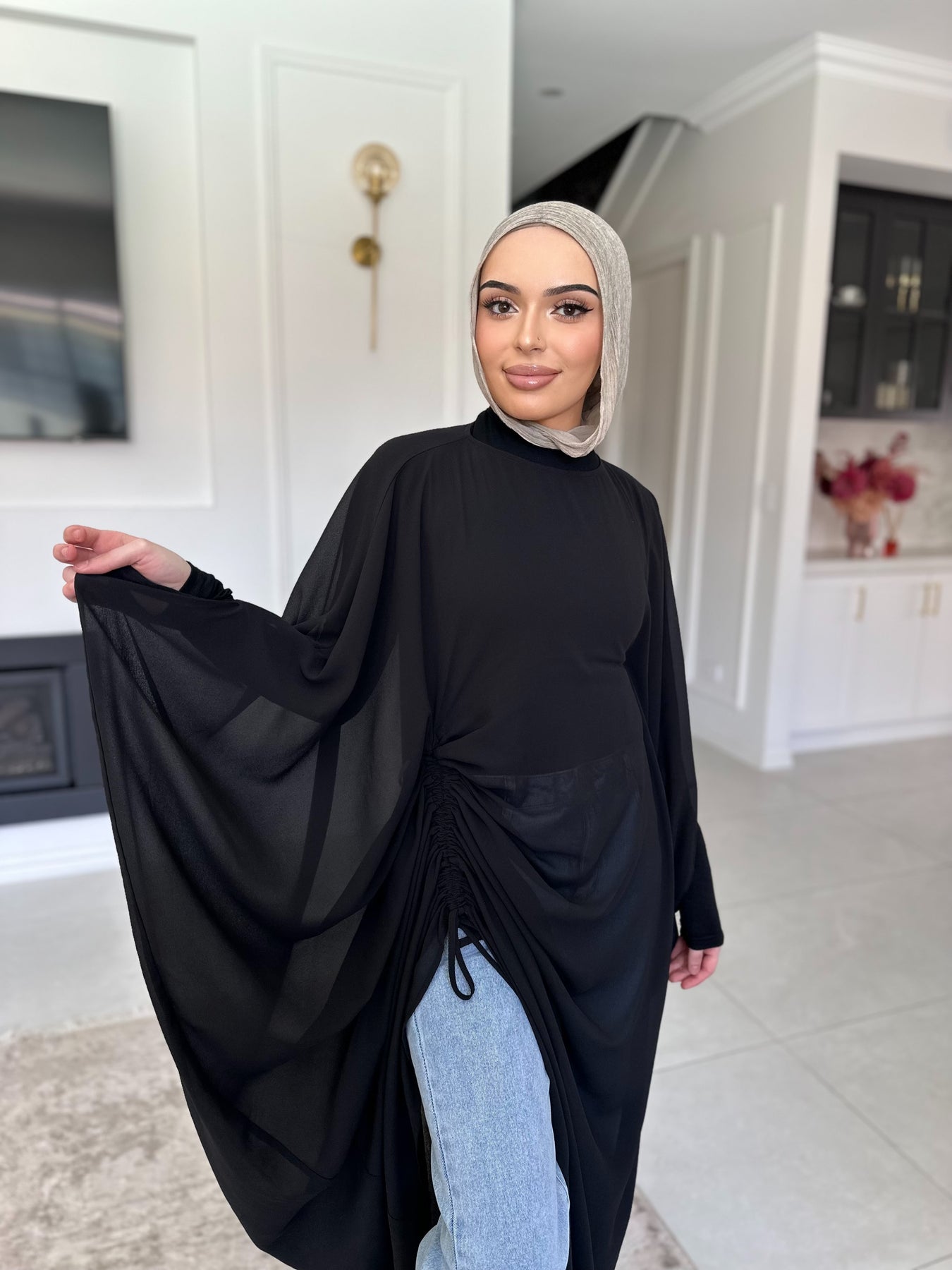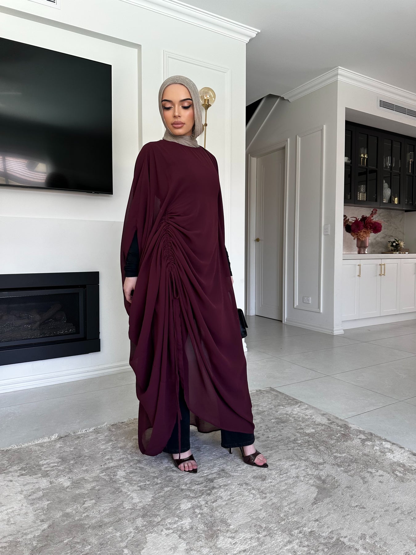 this versatile piece can be worn ruched with jeans or full length with a dress