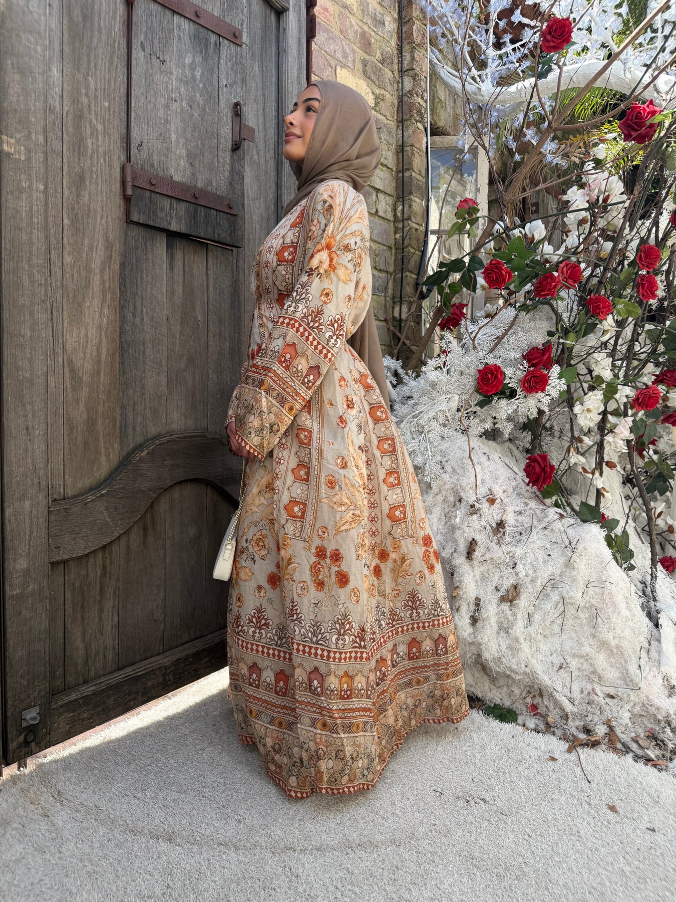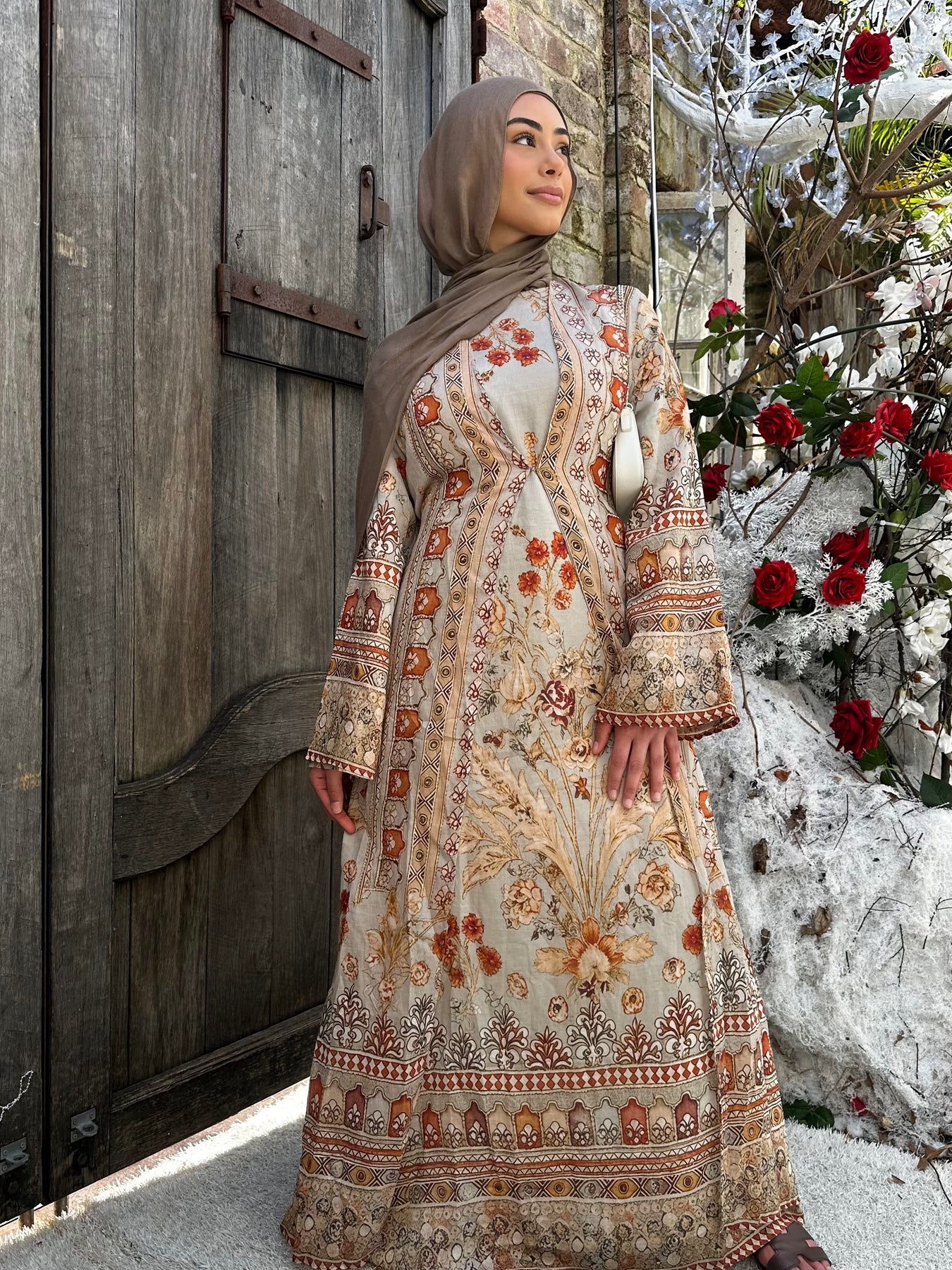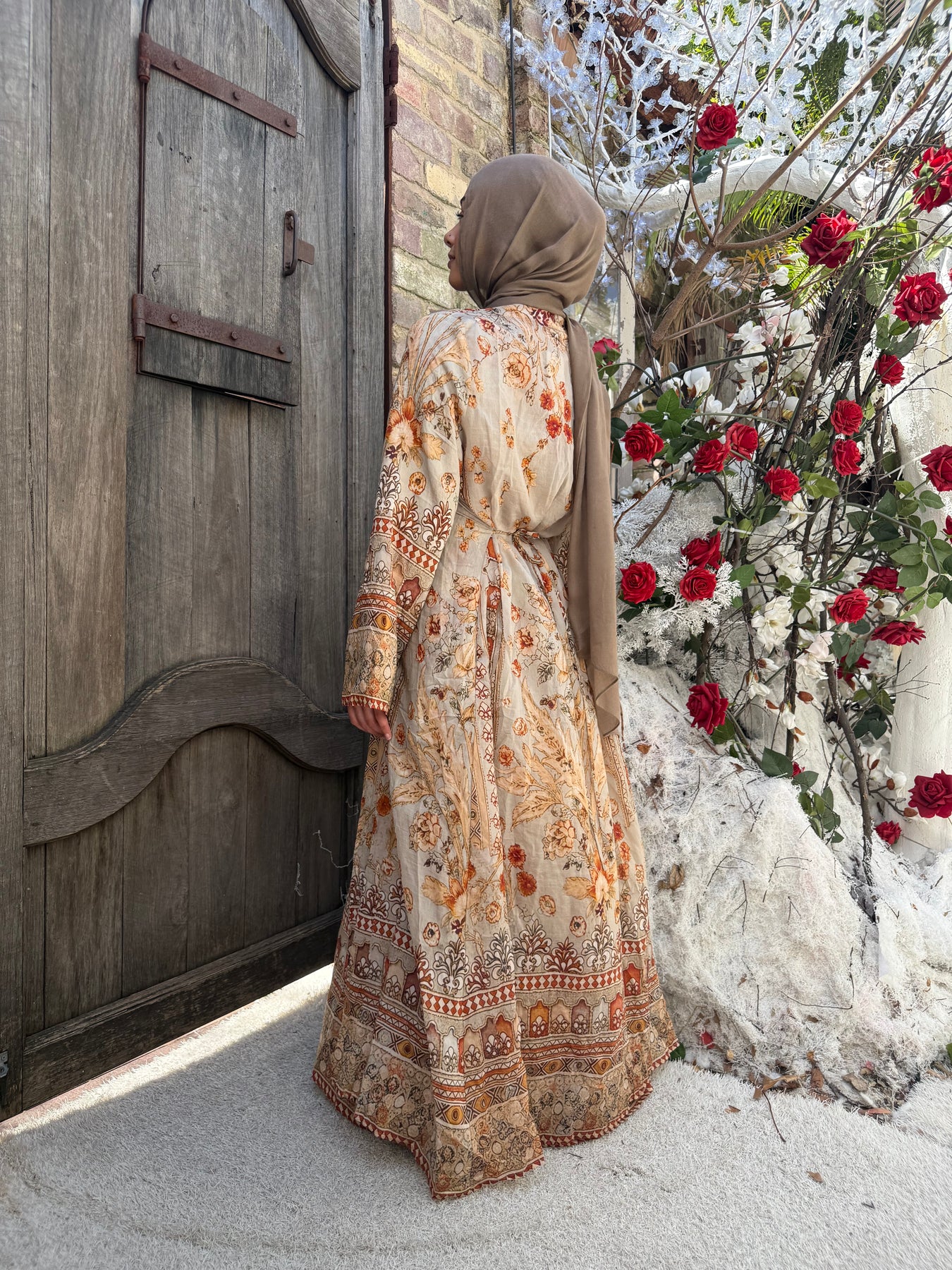 Linen blend print cape with pockets and tie
