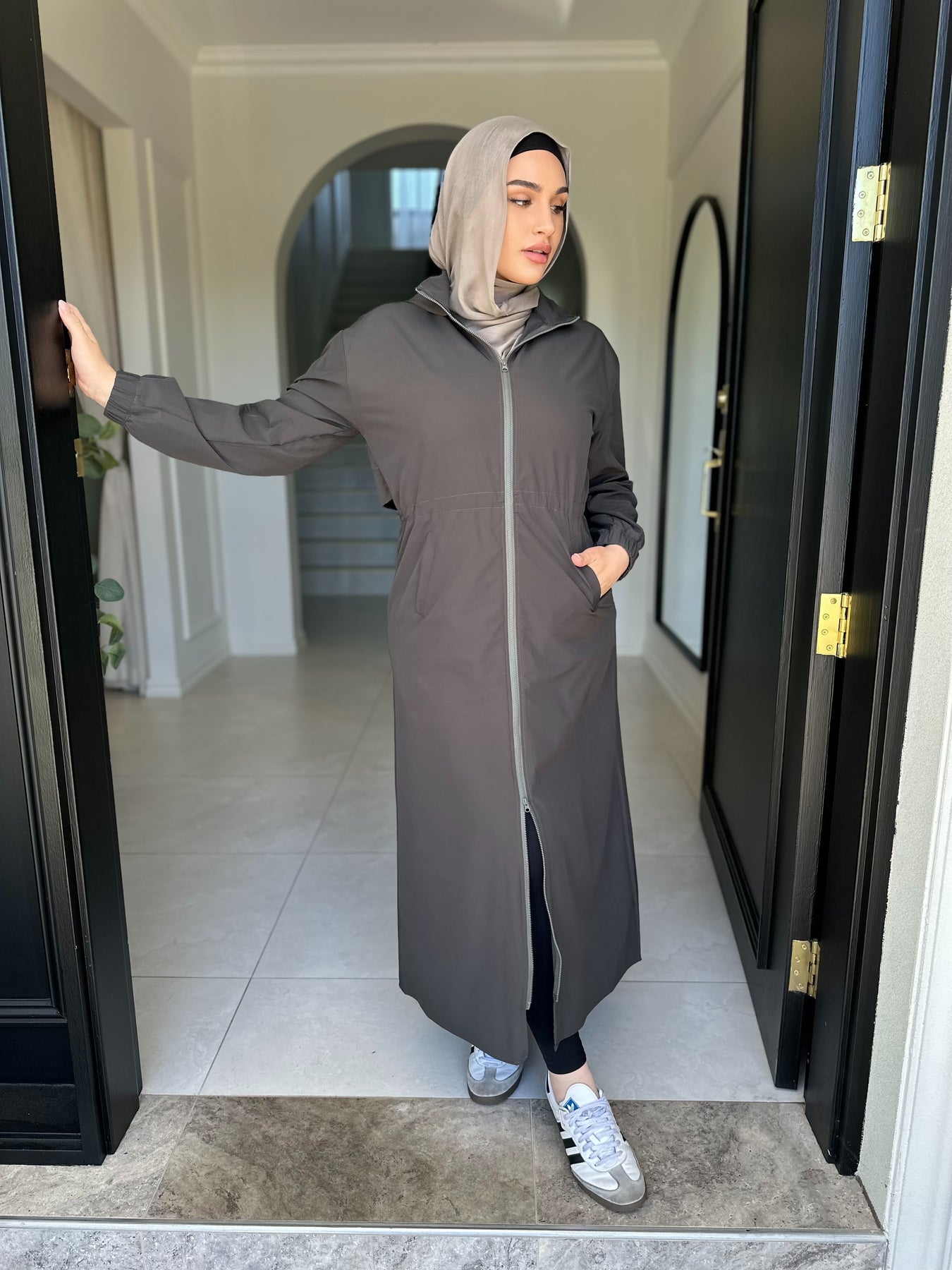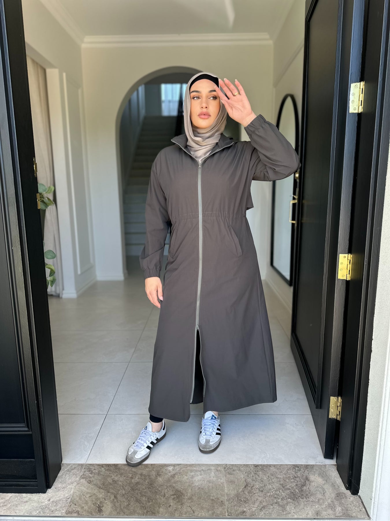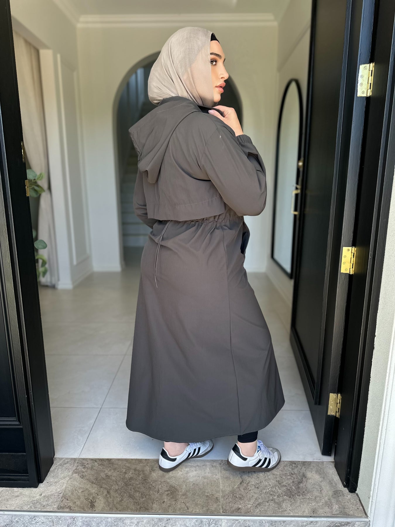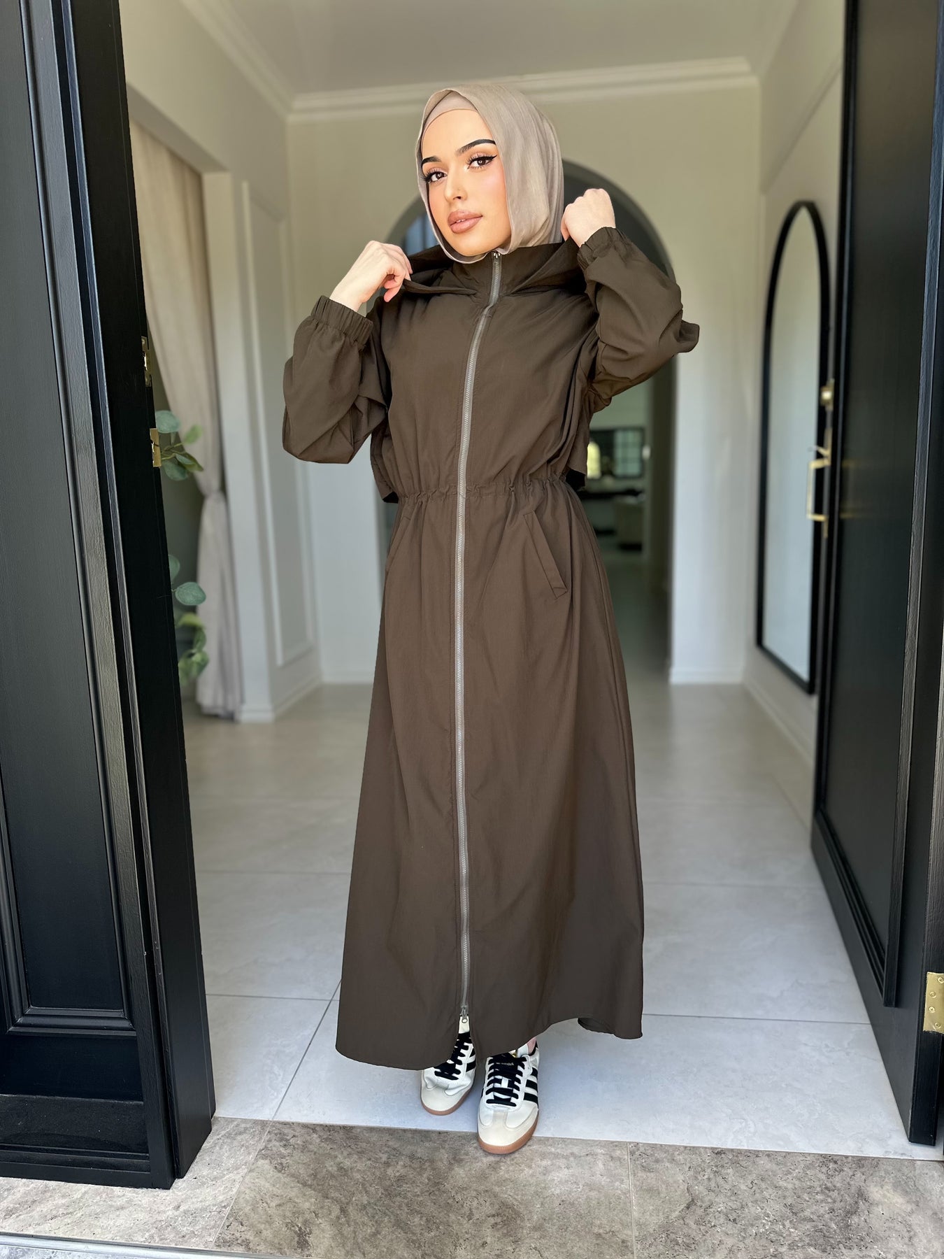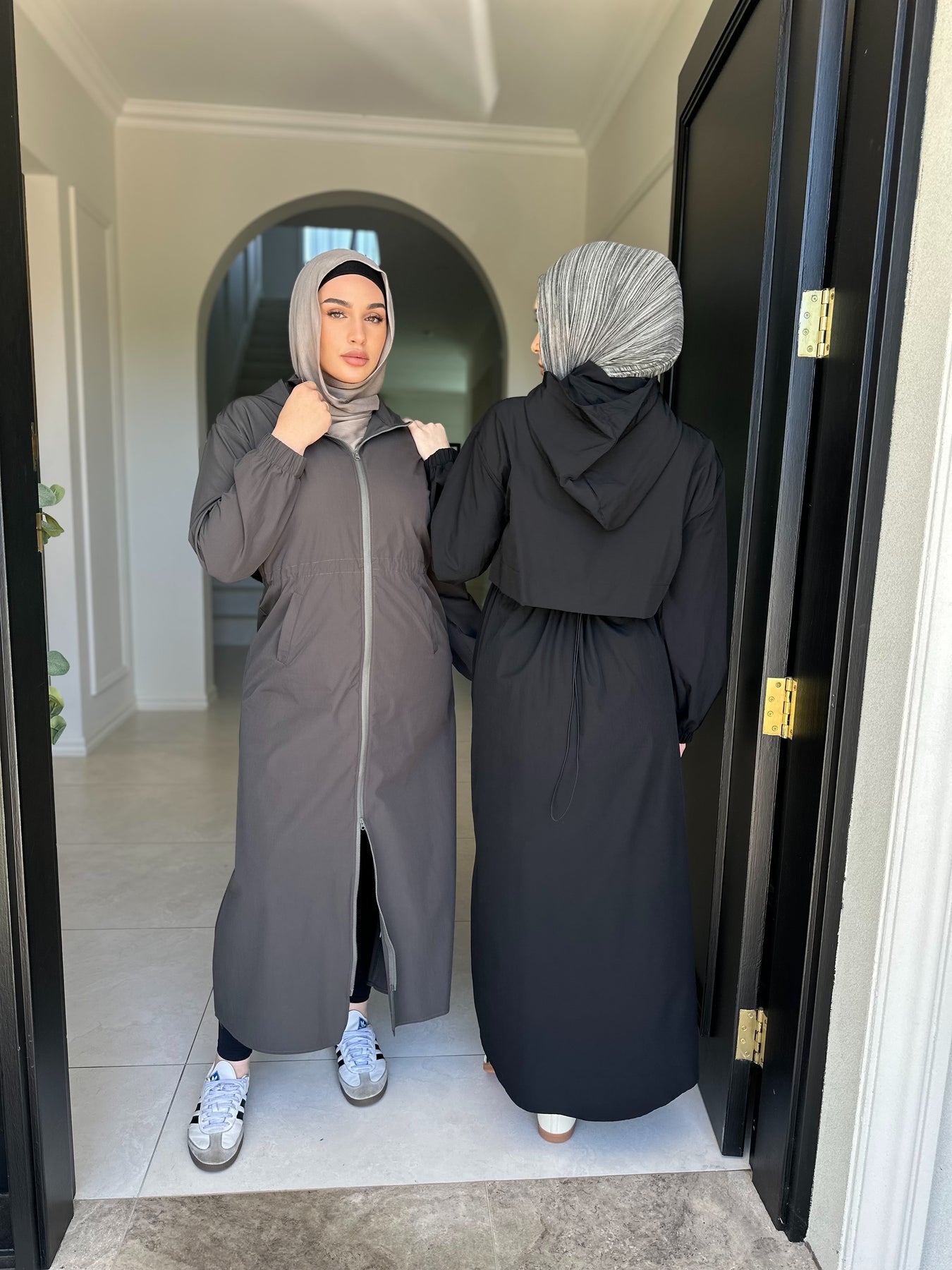 Streatch sport fabric 2 way zip trench with drawstring at back
