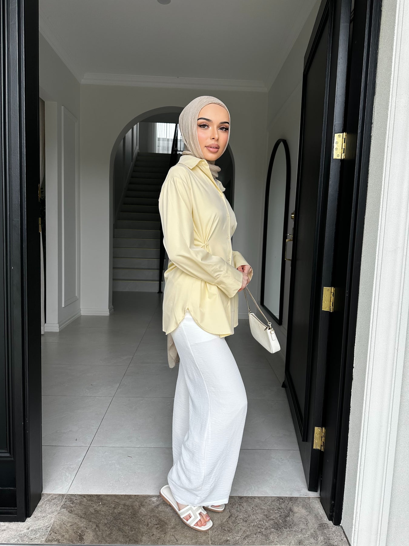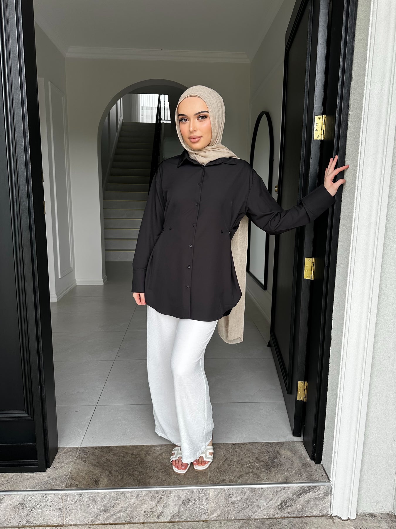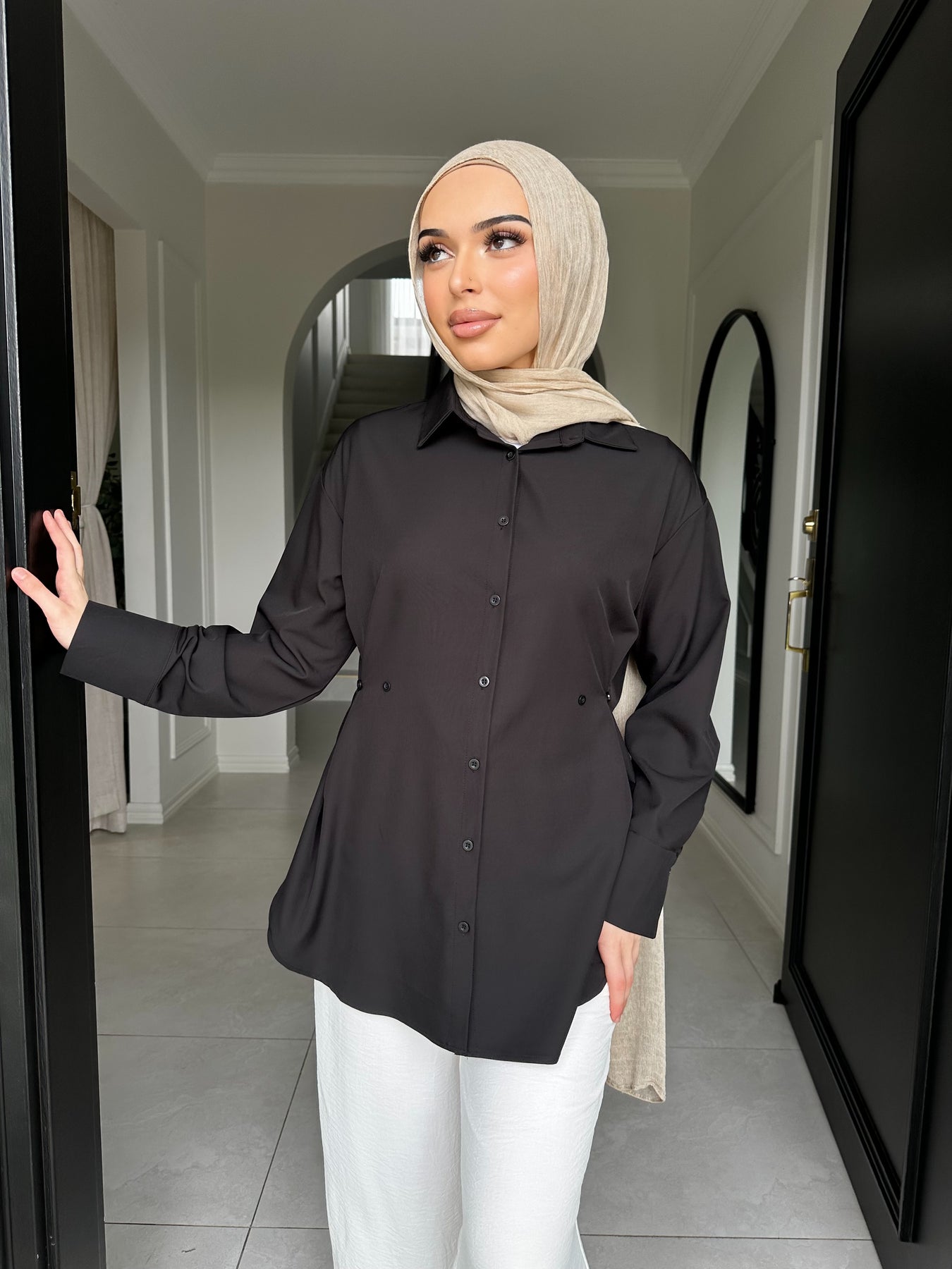 Designed with two adjustable side buttons to cinch the waist as desired, creating a refined silhouette that adapts beautifully to your shape