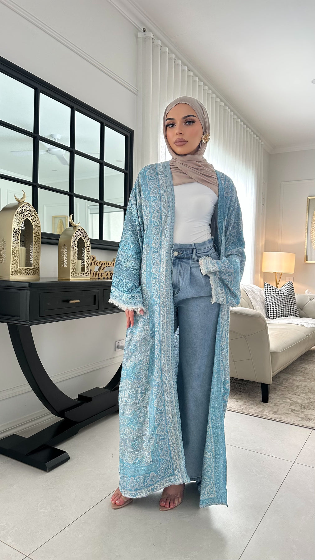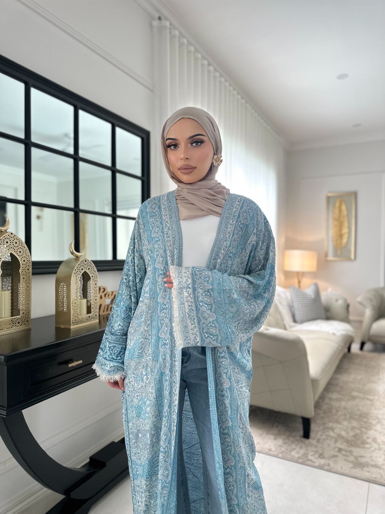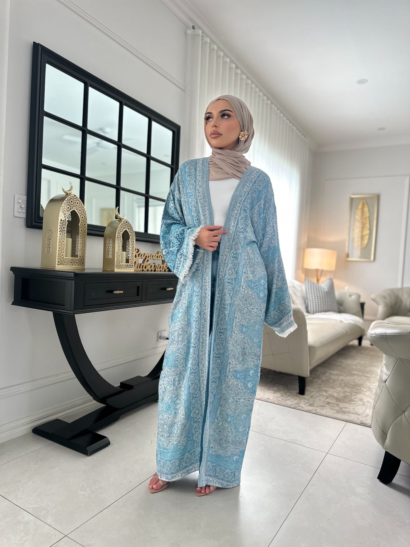 Embellished pashmina cape model wears a size 56