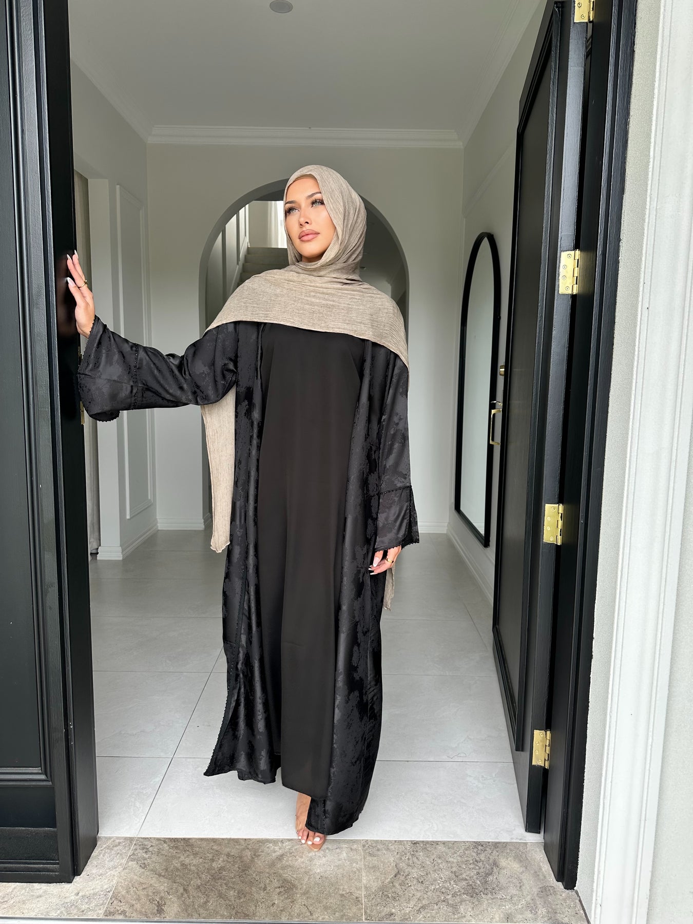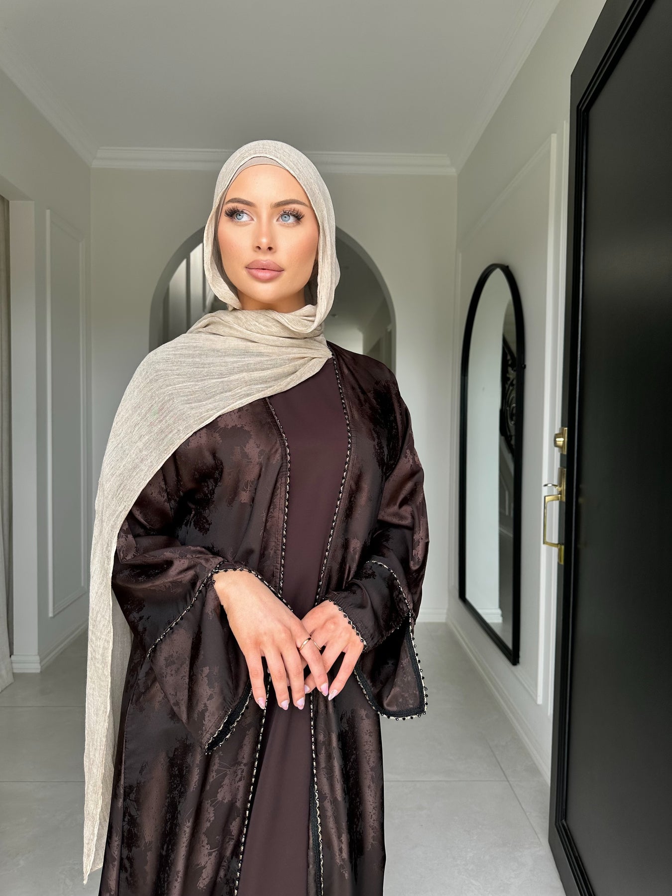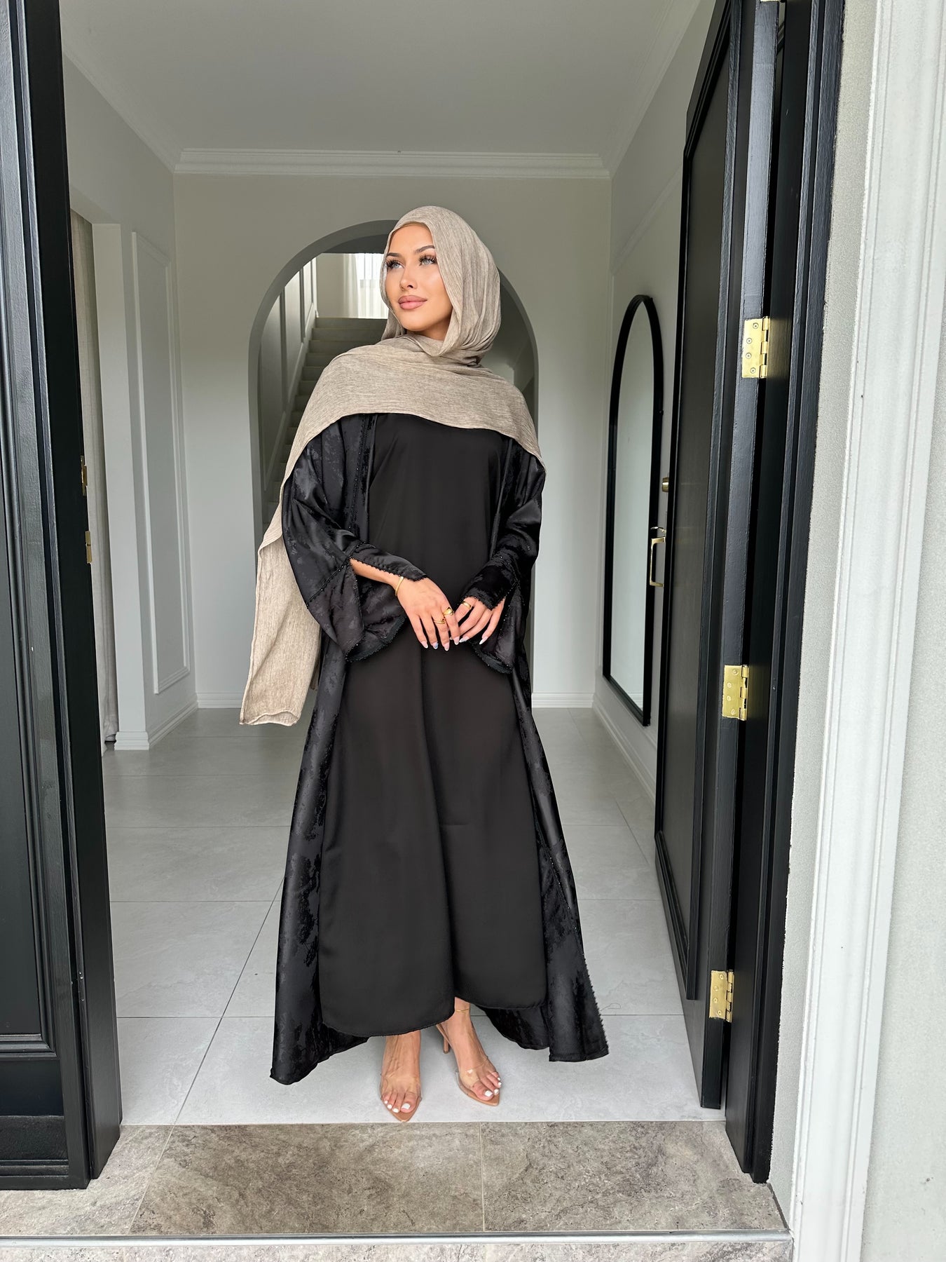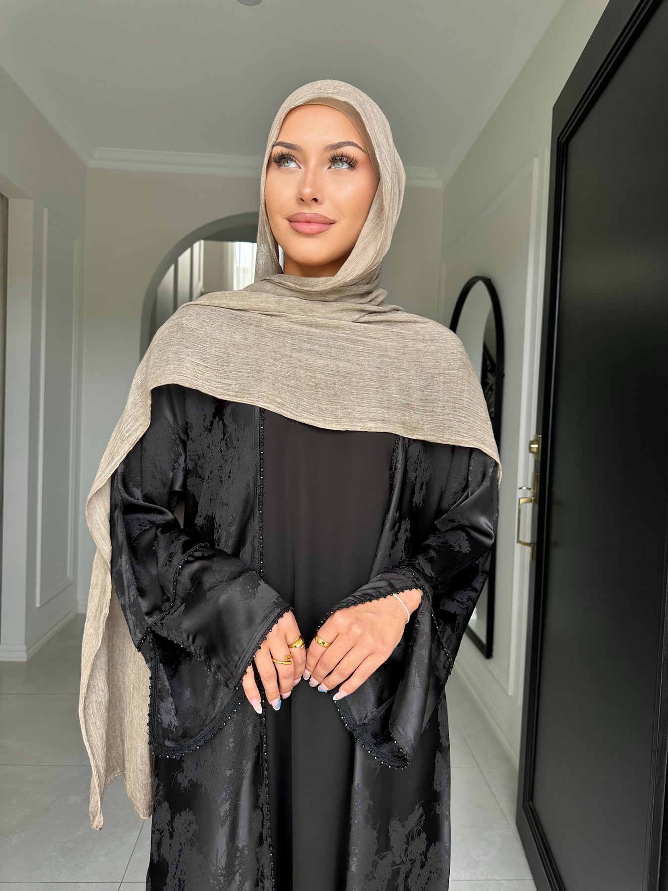 Refined simplicity at its finest — this abaya set features a soft, flowy silhouette with a subtle jacquard texture that catches the light beautifully. Designed for the woman who embodies grace and confidence, each piece pairs effortlessly with a neutral hijab for a timeless finish. Perfect for special occasions or elevated everyday wear.
