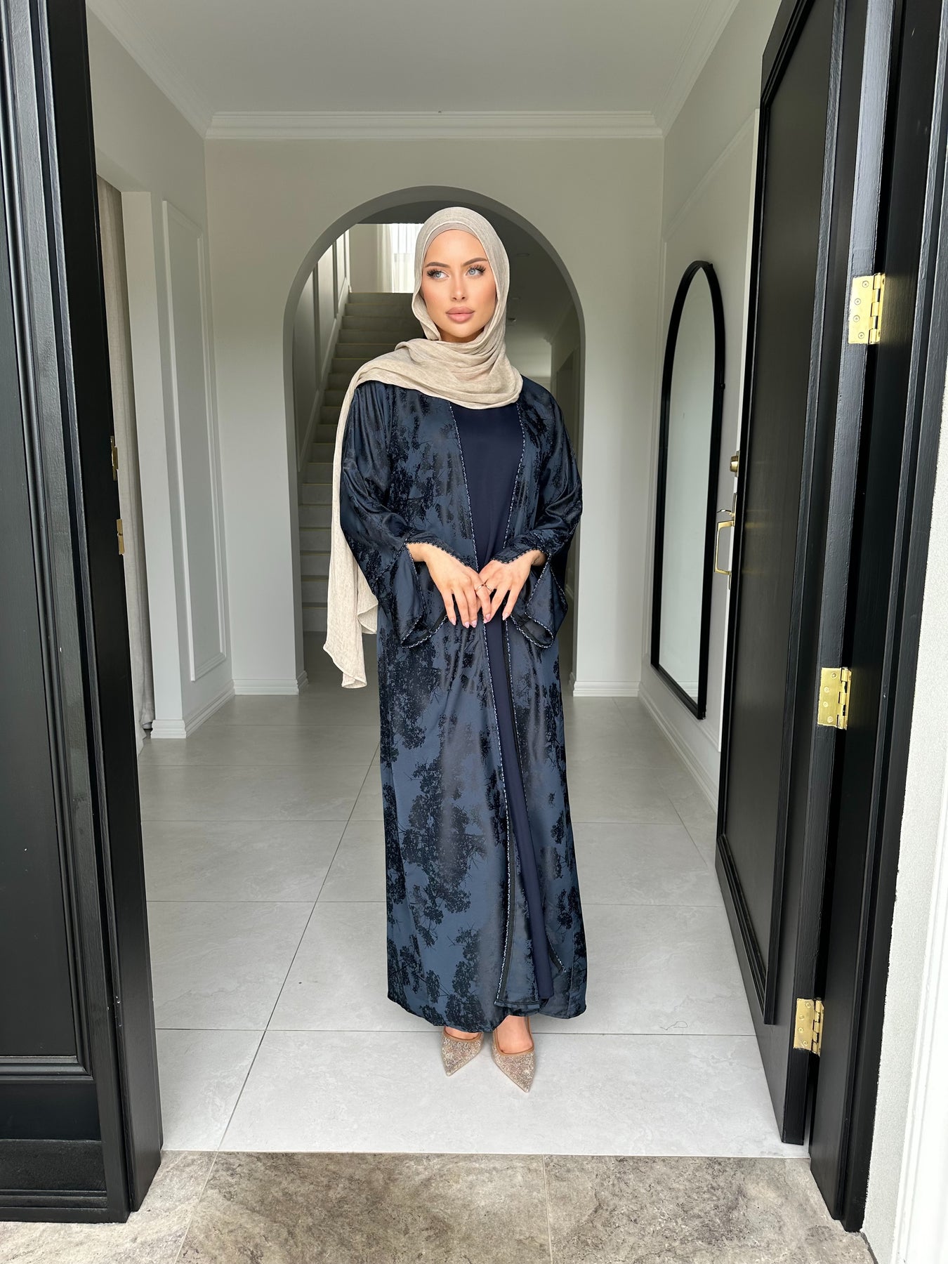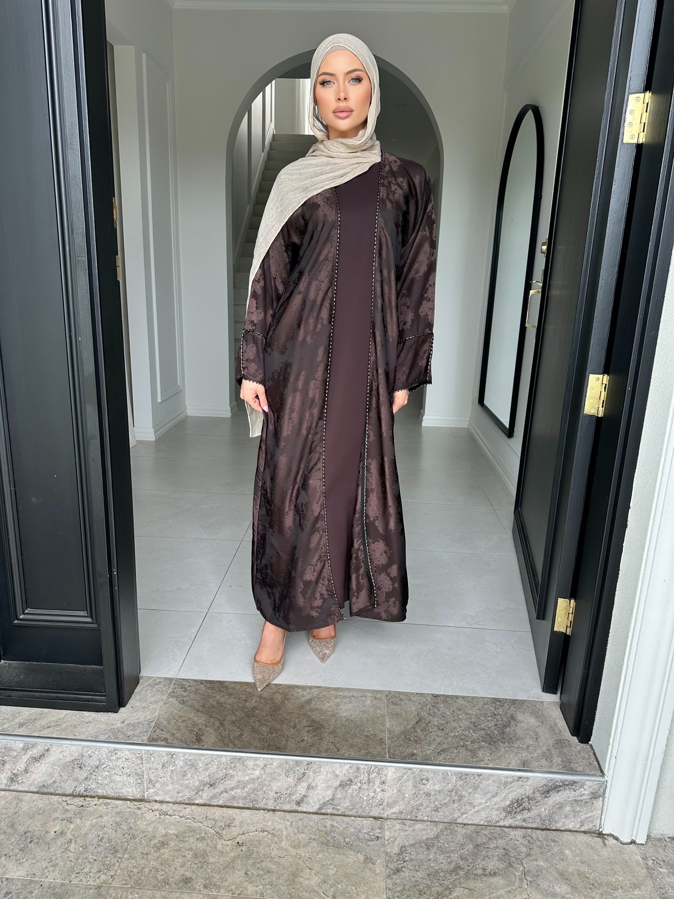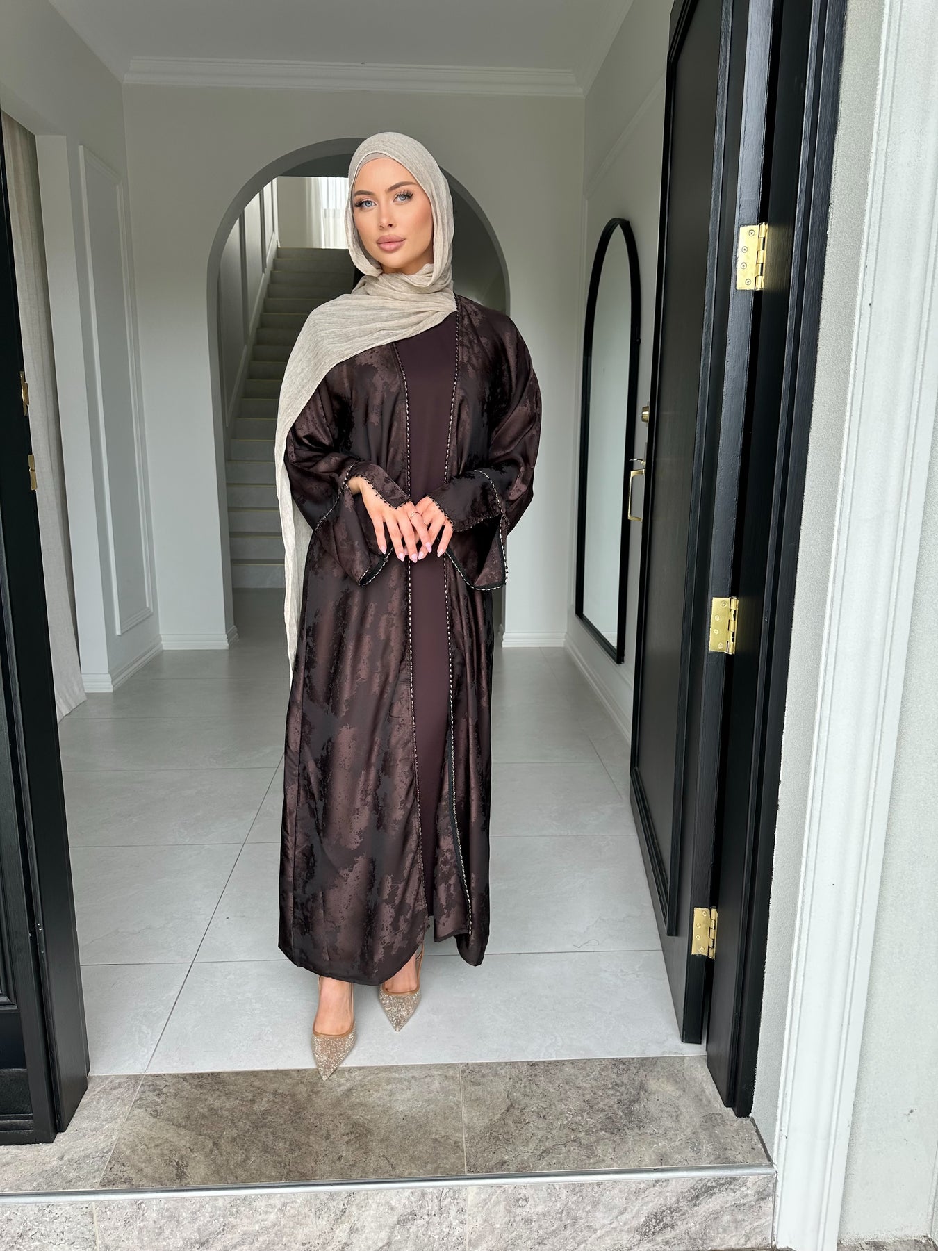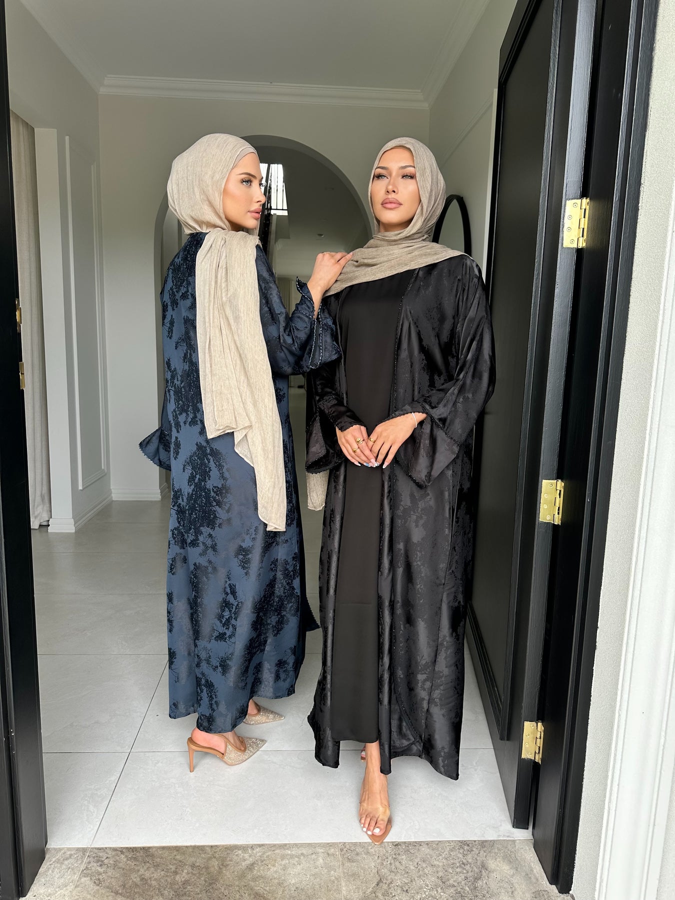 Refined simplicity at its finest — this abaya set features a soft, flowy silhouette with a subtle jacquard texture that catches the light beautifully. Designed for the woman who embodies grace and confidence, each piece pairs effortlessly with a neutral hijab for a timeless finish. Perfect for special occasions or elevated everyday wear.